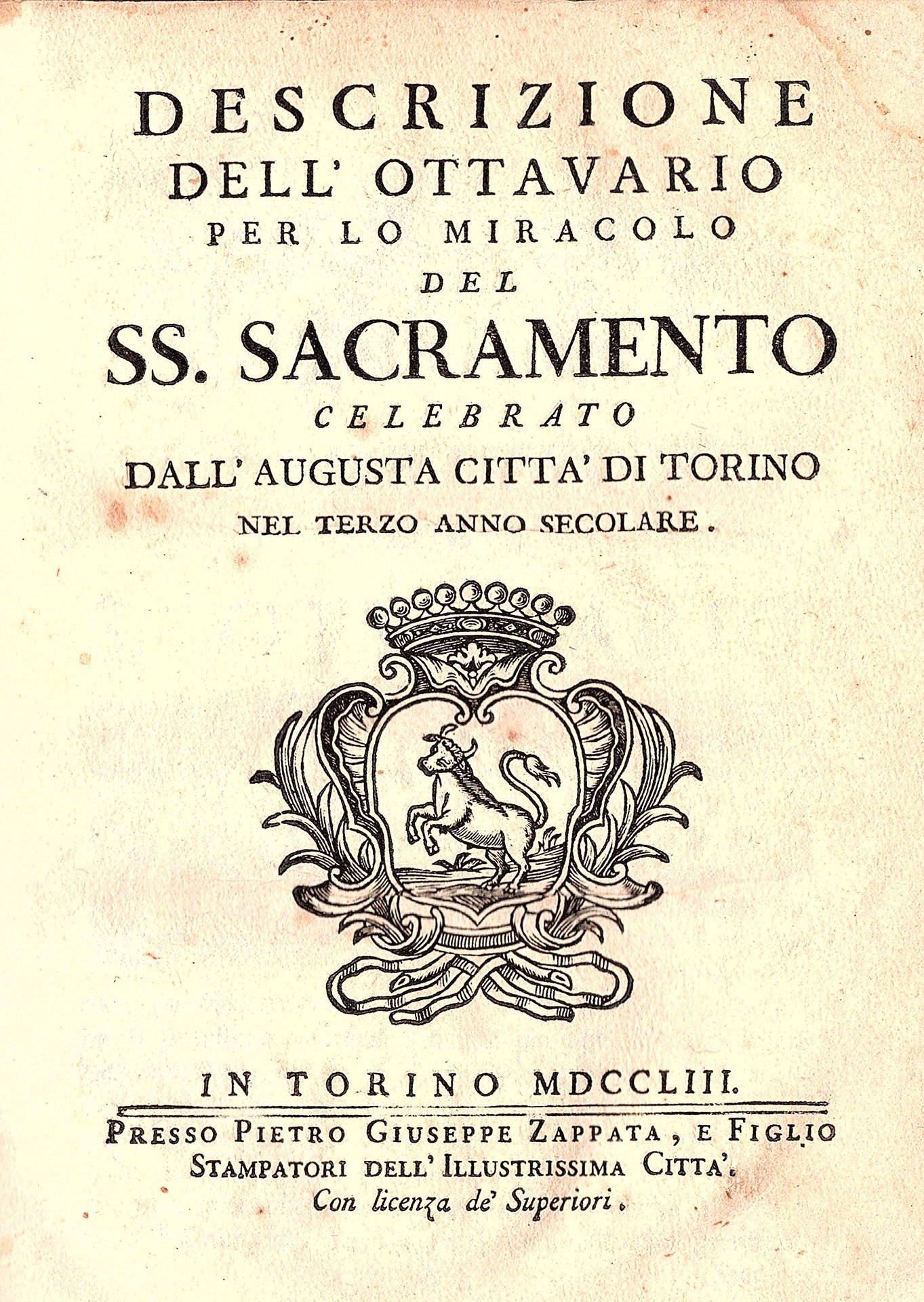 Descrizione dell' ottavario per lo miracolo del SS. SACRAMENTO celebrato dall'augusta città di Torino nel terzo anno secolare LEGATO INSIEME A Poesie nel solenne terzo centenario per lo Miracol del SS. Sacramento celebrato per otto giorni PUBBLICATO INSIEME A Componimenti poetici per le medesime secolari feste a onore del SS. Sacramento.