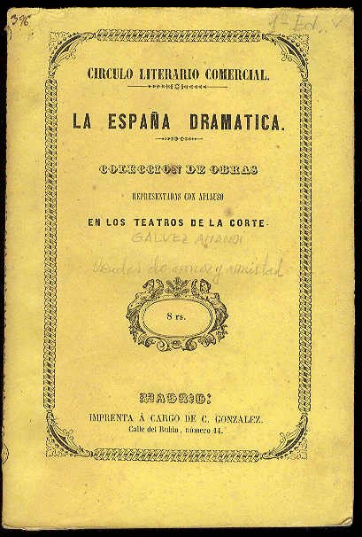 PRIMERA EDICION.- Madrid: Círculo Literario Comercial (Imp. a cargo de C. Gozález), 1851.- 88 p.; 8º mayor (20 cm.).- (Col. La España Dramática. 157).* Las primeras hojas con algunas pequeñas motas de óxido. TEATRO ESPAÑOL DE LOS SIGLOS XIX-XXI