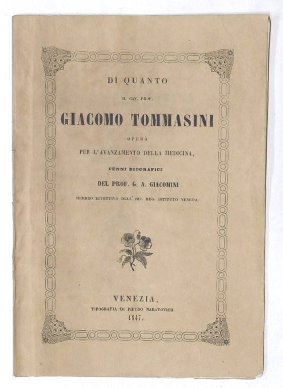 Di quanto il cav. prof. Giacomo Tommasini operò per l'avanzamento della medicina - Cenni biografici del prof. G. A. Giacomini - 1847   Pag. 16 Copertina morbida - Testo in italiano. Buone condizioni generali. Â