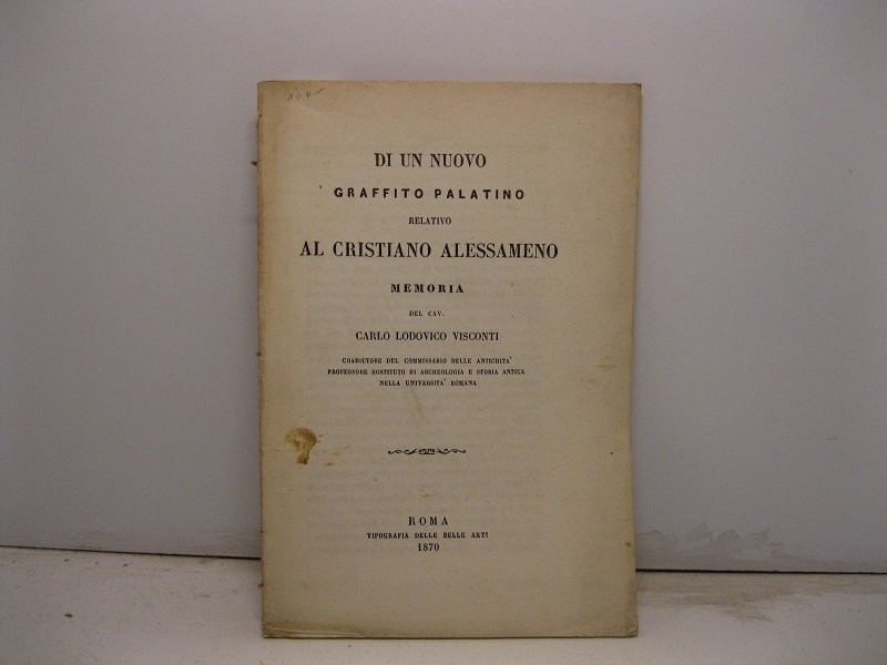 In 8, pp. 33 + (3) con una tav. f.t. rip. Strappo alla tavola. Br. rifatta. Estratto dal 'Giornale Arcadico', tomo LXII della nuova serie. Descrizione del graffito di Alessameno, o graffito del Palatino, raffigurazione irridente del Cristianesimo, datato probabilmente intorno al III secolo, raffigurante un uomo crocifisso con la testa di un animale (un asino o un mulo) e una scritta in greco antico 'Alessameno venera il suo dio'.