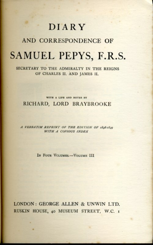 Diary and Correspondence of Samuel Pepys F. R. S.: Secretary to the Admiralty in the Reigns of Charles II. And James II.- Volume III
