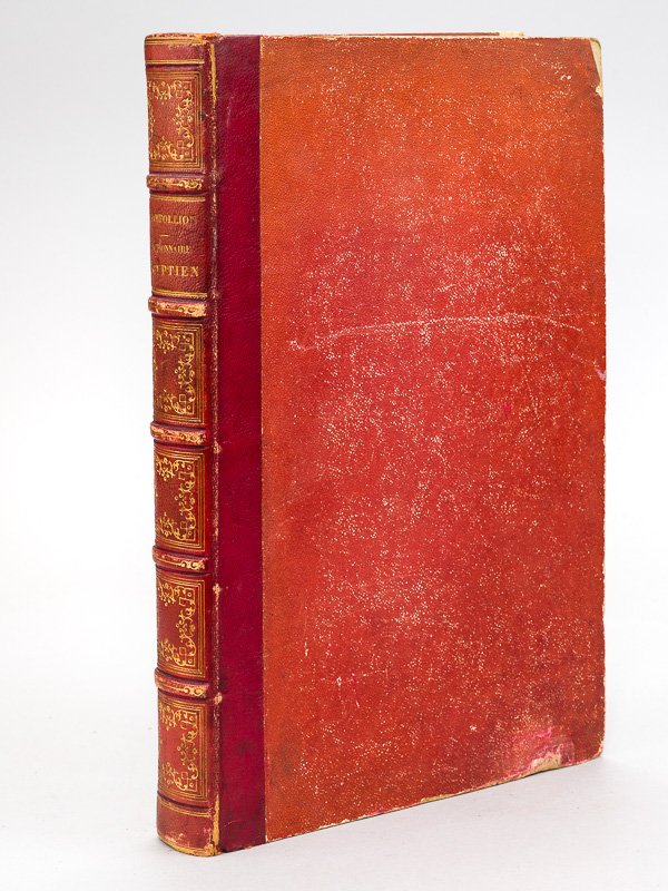 Publié d'après les manuscrits autographes et sous les auspices de M. Villemain, Ministre de l'Instruction Publique par M. Champollion Figeac, 1 vol. in-folio reliure de l'époque demi-chagrin rouge, dos à 5 nerfs orné, Chez Firmin-Didot Frères, Paris, 1841 (-1843), 2 ff., XXXVI-487 pp. Bon exemplaire de la très rare édition originale de ce monument de l'égyptologie. Entièrement lithographié (les procédés typographiques traditionnels auraient exigé la gravure de plus de 2000 types), cet ouvrage exceptionnel propose, avec la "Grammaire égyptienne", la synthèse des découvertes de Jean-François Champollion sur les hiéroglyphes égyptiens. Bon exemplaire (qq. lég. annotations au crayon, lég. mouill. marginale en queue des ff., coins et plats un peu frottés avec petits mq. de papier, coupes usées en coins inférieurs, très bon état par ailleurs). Un tableau manuscrit de l'alphabet général, de l'époque et paraphé "M.D.", a été inséré en tout début d'ouvrage. L'ouvrage fut publié en 4 livraisons, de 1841 à 1843, et sa publication s'insère dans le projet de l'Etat français qui avait acquis en 1833 les manuscrits de Champollion le Jeune, et avait chargé son frère Champollion Figeac de leur publication. L'ouvrage a été lithographié par Jules Feuquières. On découvre en fin d'ouvrage, courant sur 7 feuillets, un remarquable "Tableau général et méthodique des signes hiéroglyphiques purs et linéaires". Brunet, I, 1780