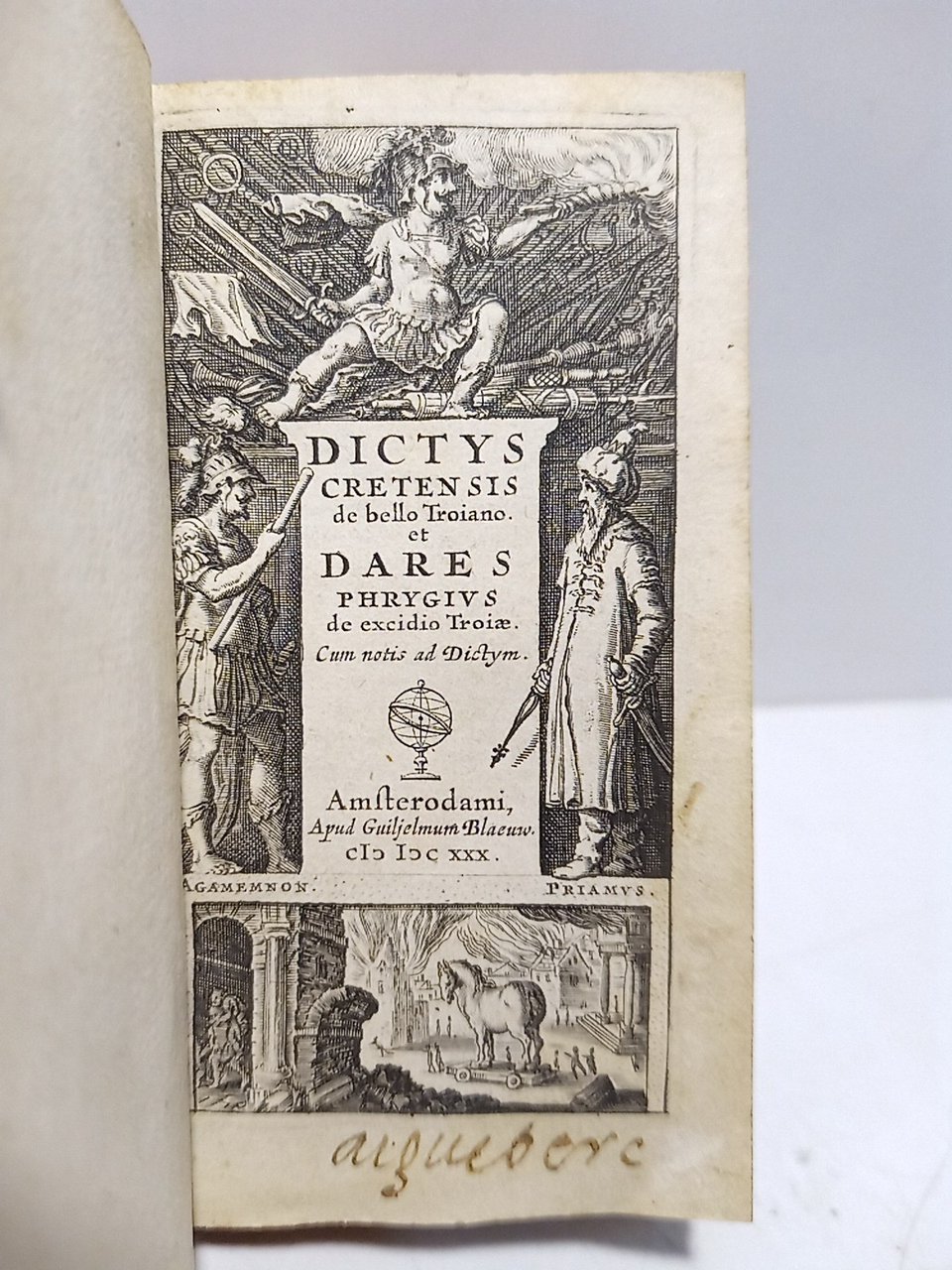 Amsterodami [Amsterdam]: Apud Guiljelmum Blaeuw, 1630.- 196 p.: Portada finamente grabada en madera, mostrando a Agamenón y Príamo junto a un tercer personaje, además del famoso caballo de Troya; 16º (10,8 x 6,4 cm); Cinta-guía de lectura; Enc. en Plena Piel original de la época, lomo dorado, cuatro nervios, cortes tintados.* Nombre de un antiguo propietario, probablemente de la época, en la zona blanca al pie de la portada. Restauraciones en los márgenes superior e inferior de las bisagras de ambas tapas, habiendo quedado fuertes. En general un precioso librito de pequeño formato con muy buen aspecto. Dictys el cretense y Dares el frigio, los supuestos autores de estas dos obras, son personajes ficticios. Los textos originales provienen de los siglos IV-V y se atribuyen a dos escritores romanos distintos, dadas las diferencias de estilo. Esta edición combina ambos siguiendo la tradición renacentista y ofrece una lectura sobre la guerra de Troya desde la perspectiva de ambos bandos, a través de las figuras de un soldado cretense y un sacerdote frigio que teóricamente narran sus experiencias en la contienda. Estas crónicas ejercieron una notable influencia en la literatura europea y sirvieron de fuente para epopeyas, traducciones y novelas históricas, marcando la concepción de la narrativa troyana desde el siglo XVI hasta la literatura moderna. GRECIA Y ROMA, FILOLOGÍA CLASICA