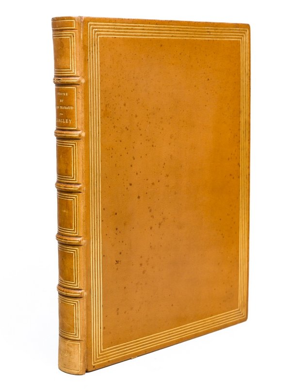 Tirage de l'Académie des Goncourt à trente exemplaires numérotés dont douze seulement mis dans le commerce, texte renouvelé pour cette édition et réimposé pour ce tirage, exemplaire n° 19 nominatif (imprimé pour Monsieur le Baron Regnault), avec une page autographe signée des frères Tharaud, qui ont recopié la page 132, 1 vol. in-8 reliure de l'époque plein veau blond, dos à 5 nerfs orné, quintuple filet doré d'encadrement en plats, tête dorée, non rogné, couvertures et dos conservés, relirue signée Canape R. D., Editions d'Art Edouard Pelletan, Paris, 1906, 2 frontispices, feuillet autographe sur papier bleu monté en tête, 155 pp., 1 f. n. ch. et 1 f. blanc Superbe exemplaire du tirage de luxe sur magnifique papier vergé, relié par Canape, et enrichi d'un bel autographe des Frères Tharaud, daté de janvier 1907, et consistant en une copie d'un très beau passage de l'ouvrage : "Cette volonté des hôtes de Mount-Nelson de ne rien laisser paraître de leurs sentiments intimes, Dingley l'admirait comme le plus beau spectacle qu'il eût encore vu, et, là où sa femme ne découvrait qu'une convention hypocrite, il reconnaissait la force d'âme de sa race, et combien la haute société anglaise, par sa maîtrise de soi, est une vieille aristocratie véritable et digne de commander".