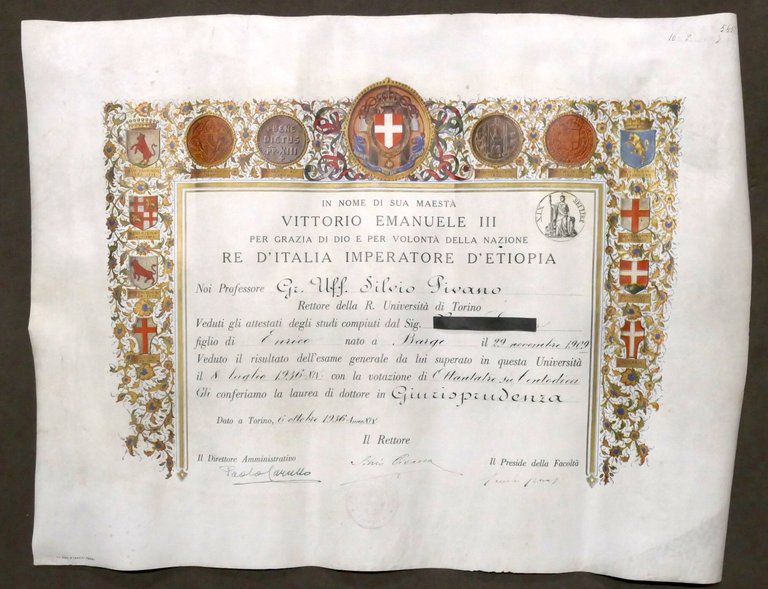 Diploma di Laurea in Giurisprudenza - Regia Università di Torino - 1936