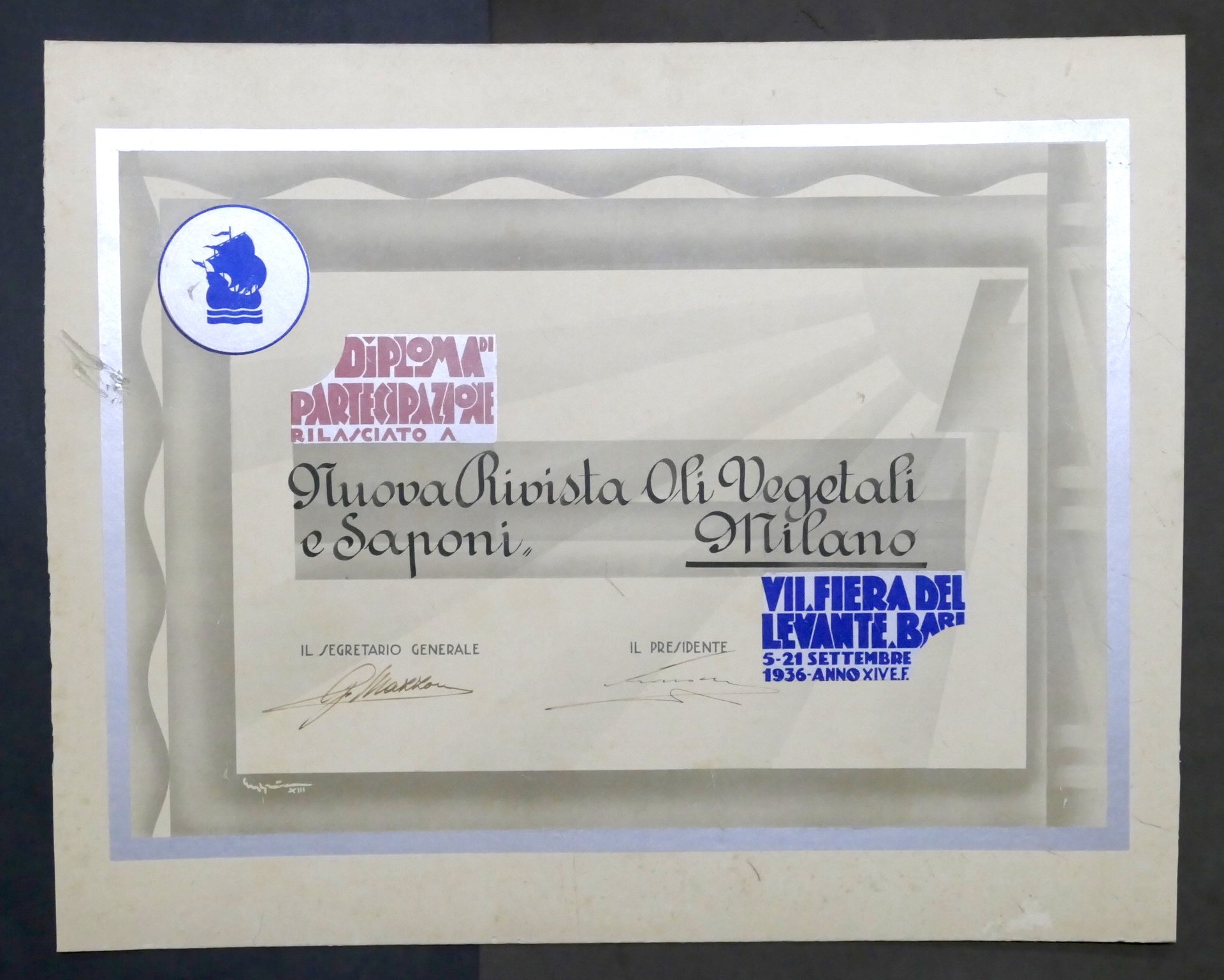 Diploma Partecipazione Rivista Oli Vegetali e Saponi - Fiera del Levante 1936 | Libri antichi e moderni |