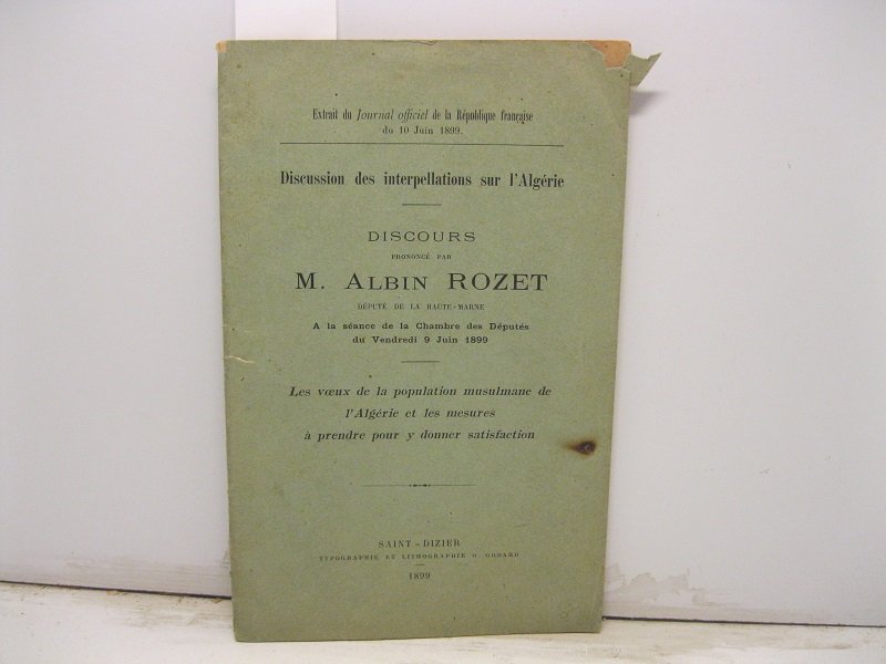 Discours prononce' depute' de la Haute-Marne a la se'ance de la Chambre des Deputes du Vendredi 9 Juin 1899. Les voeux de la population musulmane de l'Algerie et les mesures a' prendre pour y donner satisfaction | Libri antichi e moderni | Rozet Albin