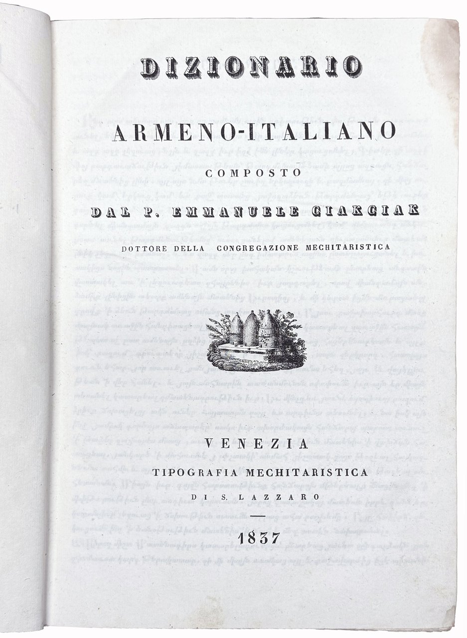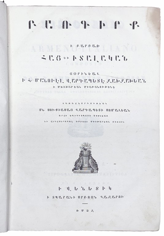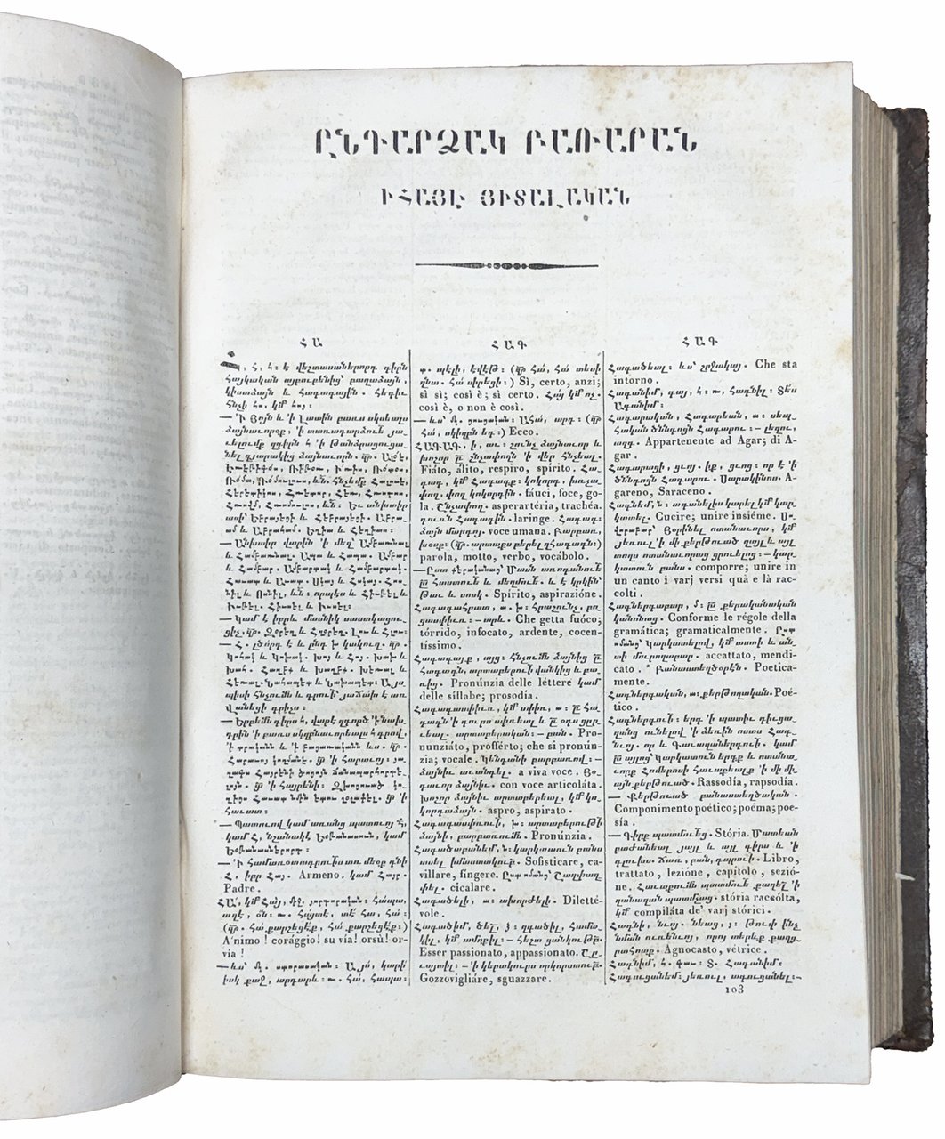 Rare first edition of this important Armenian-Italian dictionary. The author, born in Gümüşhane, Turkey, also known as Manouel Chakhchakhian or Manuel Caxcaxean or Manowel Jakhjakhean, was a priest of the Armenian Catholic Mekhitarist Congregation of Venice. He also published in Venice an Italian-Armenian-Turkish dictionary in 1804 and an Italian-French-Armenian-Turkish dictionary in 1829.