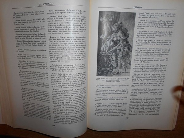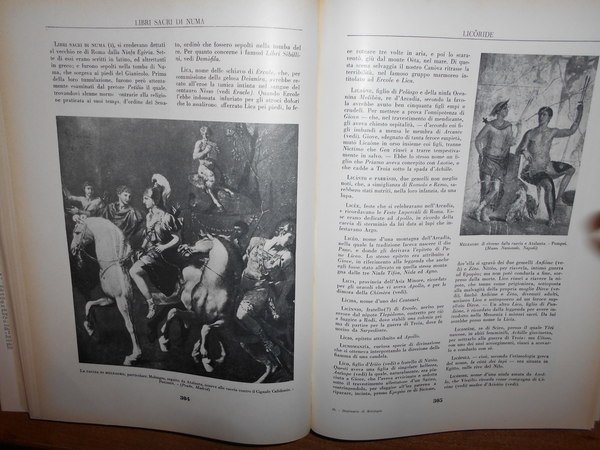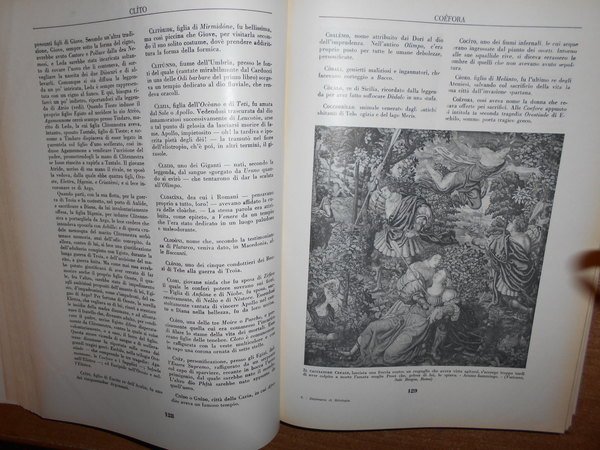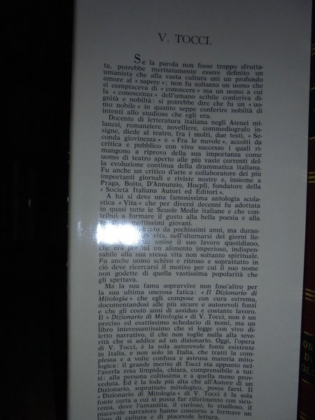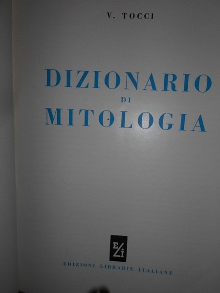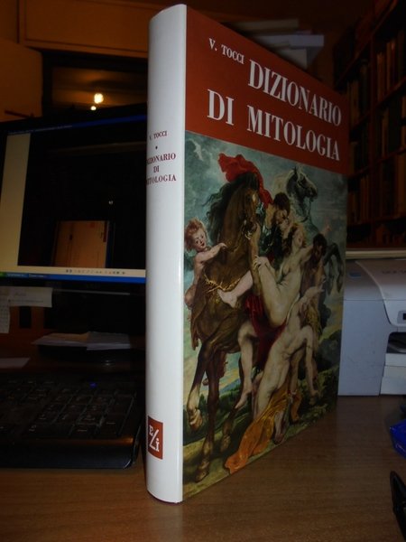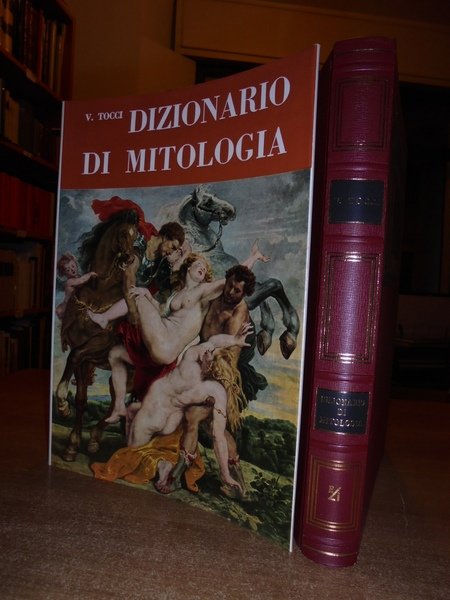 V. Tocci. Torino, Edizioni Librarie Italiane, 1958. Dizionario di Mitologia. In-4°, pelle edit. con fregi e titoli in oro, sovracopertina ill. a col. viii, 540 pp. con numerose illustrazioni in bianco e nero nel testo. Bell' esemplare con sovracopertina intatta. Uff. TV. mob. nostro