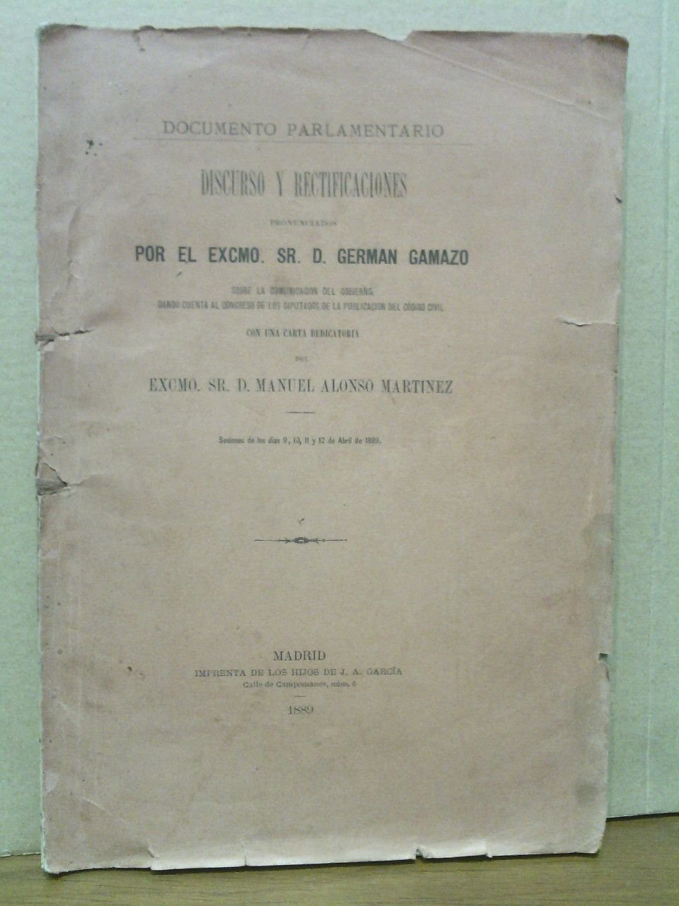 Documento Parlamentario: Discurso y rectificaciones sobre la comunicación del Gobierno dando cuenta al Congreso de los Diputados de la publicación del Código Civil / Con una carta dedicatoria del Excmo. Sr. D. Manuel Alonso Martínez. (Sesiones de los días 9, 10, 11 y 12 de Abril de 1889)