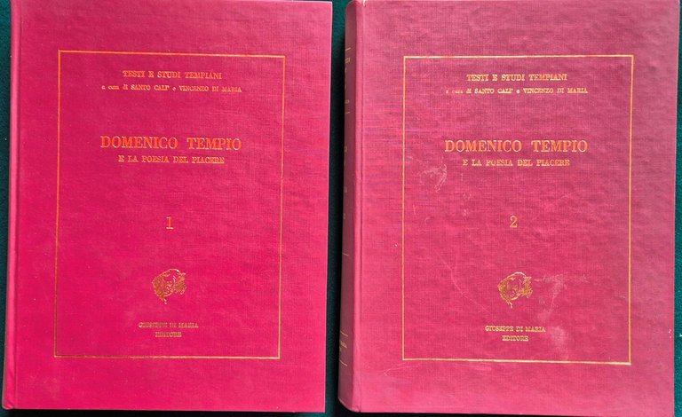 Testi e studi tempiani - in 4° - pp.LXXX +415; LXXXVI+ 575 - Tela con titolo in oro al piatto superiore ed al dorso - Due Volumi - Numerosissime illustrazioni in b.n. - Il libro presenta Domenico Tempio non come un semplice autore di poesie proibite, ma come un intellettuale d'avanguardia che ha usato il tema del piacere e dell'eros per affermare la dignità della natura umana e per denunciare le ingiustizie sociali della Sicilia borbonica