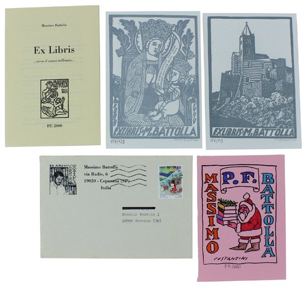 (Codice GF/0066) Due ex ibris xilografici, stampa in grigio, cm 17x12. Allegati: plaquette (tiratura numerata, n.107) a cura e con testo di M.Battolla, con la giustificazione degli ex libris e biglietto d'auguri, a colori su carta rosa, con incisione dello stesso Costantini e auguri a matita firmati da M.Battolla. Nella busta originale viaggiata, con incisione e ex libris cihudilettera. ~~~ SPEDIZIONE IN ITALIA SEMPRE TRACCIATA