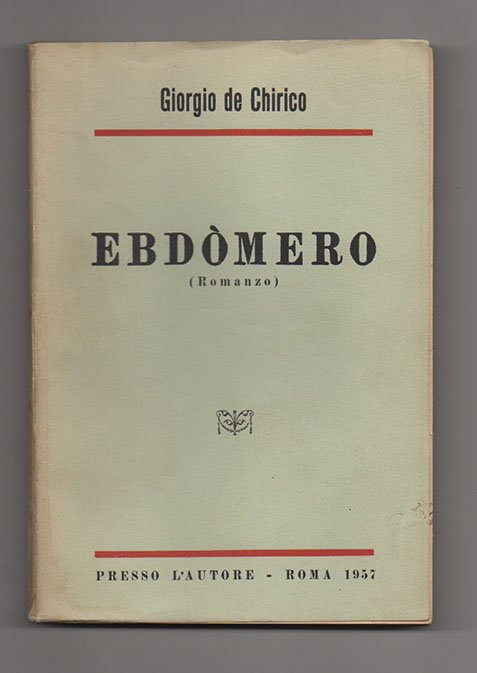 LIBROEdizione privata voluta dall’autore.Esemplare in ottimo stato privo della sovracoperta.Nella Parigi della seconda metà degli anni Venti attraversata dalla guerra dichiarata da André Breton a traditori vecchi e nuovi del surrealismo, l’«Hebdomeros» di Giorgio de Chirico arrivò come una folgorante risposta. Principale bersaglio polemico del capo della compagine surrealista dopo essere stato ammirato e celebrato come maestro e precursore, nel 1929 il padre della pittura metafisica diede alle stampe per i tipi delle Éditions du Carrefour di Pierre-Gaspard Levy un libro di assoluta liricità e bellezza, destinato a superare il romanzo autobiografico «Nadja» licenziato da Breton soltanto un anno prima con Gallimard. Recensito già nel febbraio del 1930 da Edmond Jaloux su «Les Nouvelles Littéraires» con grande favore, il romanzo di de Chirico venne celebrato in Francia come esempio di perfetta traduzione delle sue visioni artistiche oniriche e atemporali in parola, acquisendo presto la fama di capolavoro letterario. Ma se tale e folgorante fu il successo dell’«Hebdomeros» in terra francese, ben più faticosa e lento fu il suo percorso in Italia. Proposto già nel 1928 all’amico Giovanni Scheiwiller – si ricorderà qui che il libro venne scritto, forse contemporaneamente, in italiano e in francese – e nel 1938 alle Edizioni della Cometa, la prima edizione italiana sarebbe infine apparsa solo nel 1942 con Bompiani, giustamente presentato nella nota al risvolto anteriore della sovracoperta come un libro celebre all’estero, ma sconosciuto agli italiani. Passato quasi inosservato e per molti anni quasi dimenticato, nel 1957 de Chirico decise comunque di approntare la ristampa privata qui presenta per ricordare il fratello Alberto Savinio, scomparso nel maggio del 1952. Recita infatti la dedicatoria posta solennemente all’antiporta: «Alla sacra memoria di mio fratello Alberto Savinio». Curiosa e dai contorni difficili da chiarire la storia editoriale del volume che, in alcuni esemplari, contiene correzioni autografe dell’autore a emendare il testo da alcuni refusi. Benché esso riporti infatti al piatto anteriore e al frontespizio la dicitura «Presso l’Autore», la sovracoperta - che in tutto riprende quella propria all’edizione francese - rimanda, al lato inferiore, all’editore Scheiwiller con l’indicazione «All’insegna del Pesce d’Oro – Milano». Poco riferita anche nei maggiori cataloghi specializzati, la storia dell’irregolare presenza della sovracoperta può forse essere spiegata immaginando l’acquisizione da parte dell’editore milanese di una parte della tiratura, poi diffusa nella nuova confezione conosciuta in due varianti: una marrone chiaro e una azzurra.