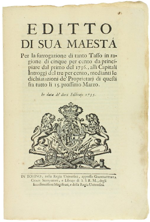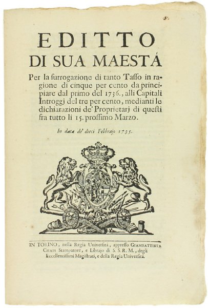 EDITTO DI SUA MAESTA' per la surrogazione di tanto Tasso in ragione di cinque per cento. alli Capitali Introggj del tre per cento. In data de' dieci Febbrajo 1735 [documento originale] | Libri antichi e moderni | Carlo Emanuele Iii.
