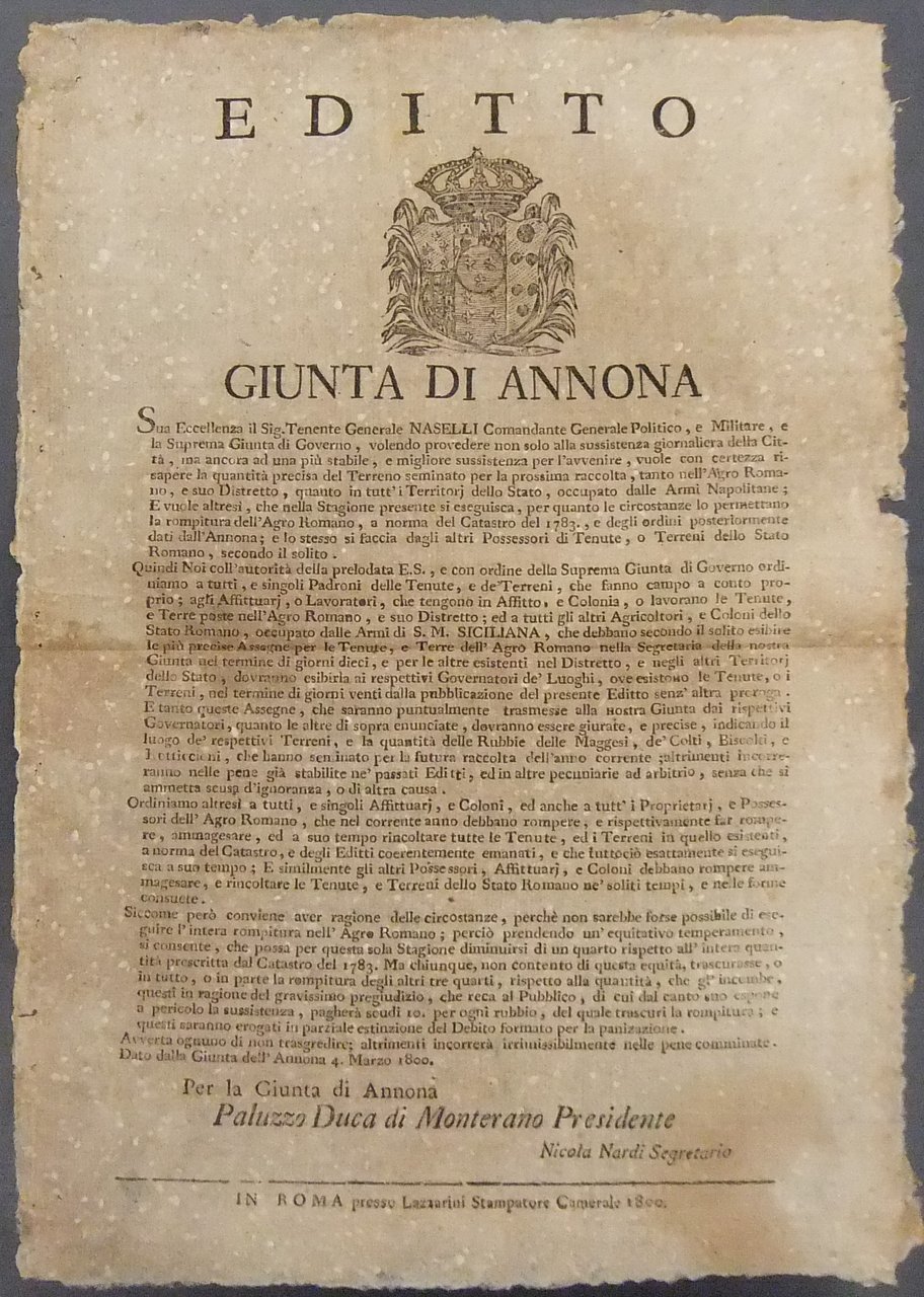 Editto Giunta di Annona. Obbligo per i proprietari terrieri, i coloni e gli affittuari di consegnare le Assegne per le terre e le tenute di loro proprietà a cui si aggiunge la messa a coltura delle terre incolte | Libri antichi e moderni | Ferdinando Iv - Don Diego Naselli - Paluzzo Duca Di Monterano