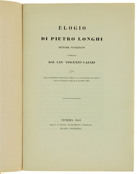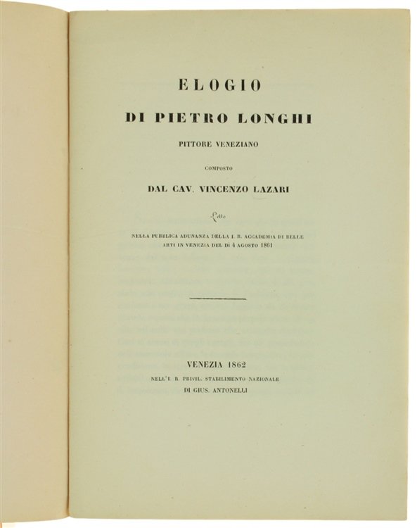 ELOGIO DI PIETRO LONGHI pittore veneziano letto nella pubblica adunanza della I. R. Accademia di belle arti in Venezia del di 4 agosto 1861 | Libri antichi e moderni | Lazari Vincenzo.
