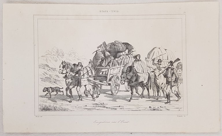 Veduta storica: emigrazione dal sud all'ovest degli Stati Uniti del 1838 circa. Autore: Branche su soggetto di Vernier Data: 1838 circa Tecnica: acquaforte Dimensione foglio: 12,5x20,5 cm Dimensione incisione: 10,5x15 cm Condizioni: Buone. Rare fioriture. Nice animated view of some people emigrating from South to West States of 1838 circa. Author: Branche after Vernier Date: 1838 circa Technique: Steel etching Leaf Dimension: 20,5x12,5 cm (8.1x4.9 inches) Engraving Dimension: 10,5x15 cm (5.7x3.7 inches) Conditions: Good conditions. Some foxings.