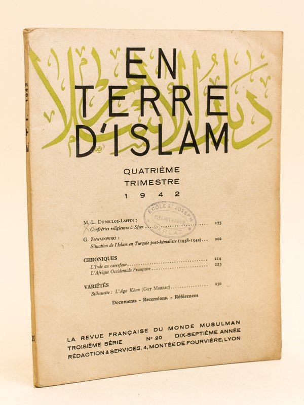 1 vol. in-8 br., En Terre d'Islam. La Revue Française du Monde Musulman. Quatrième trimestre 1942, pp. 165-250. [ Contient : ] Dubouloz-Laffin : Confréries religieuses à Sfax ; Zawadowski : Situations de l'Islam en Turquie post-kémaliste (1938-1942) ; L'Inde au carrefour ; L'Afrique Occidentale Française ; Silhouette : L'Aga Khan Bon état (discret cachet d'institution religieuse)