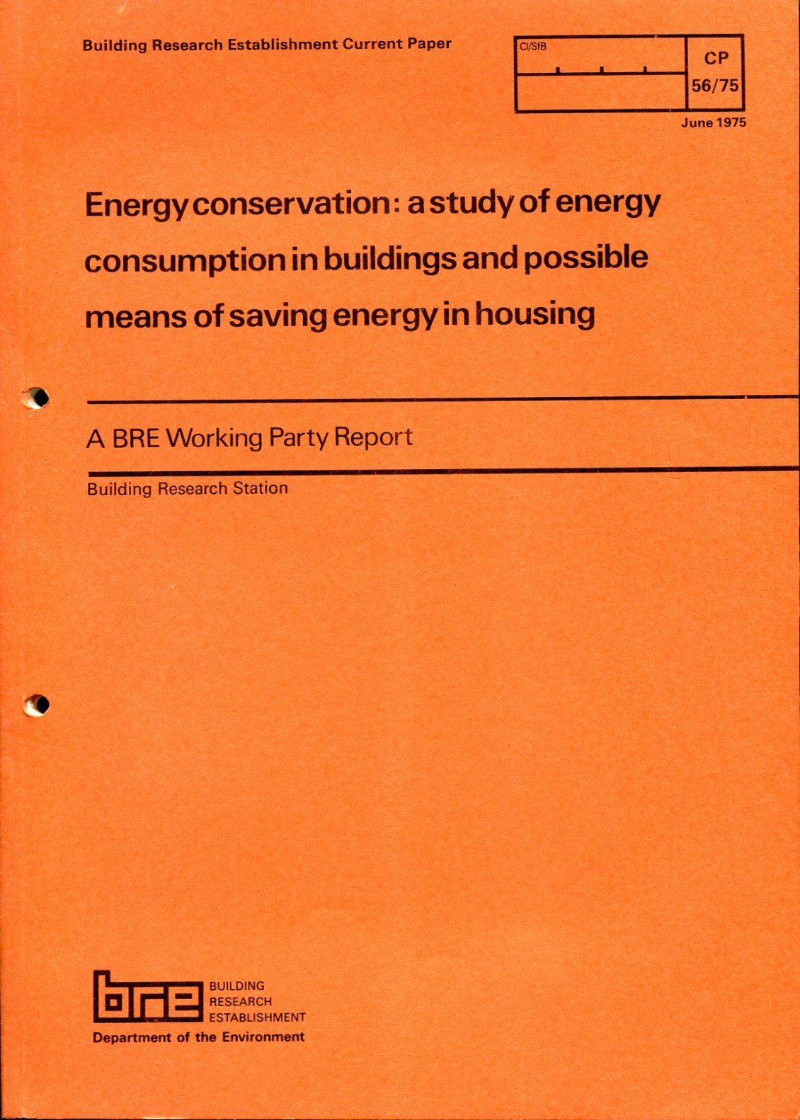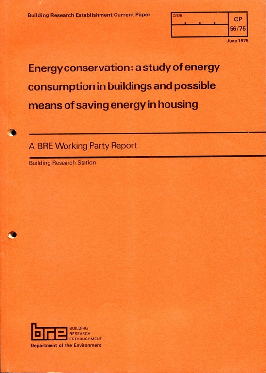 No marks or inscriptions. No creasing to covers or to spine. A very clean very tight copy with bright unmarked boards, hole-punched for filing and no bumping to corners. 64pp. BRE Working Party Report on energy conservation.