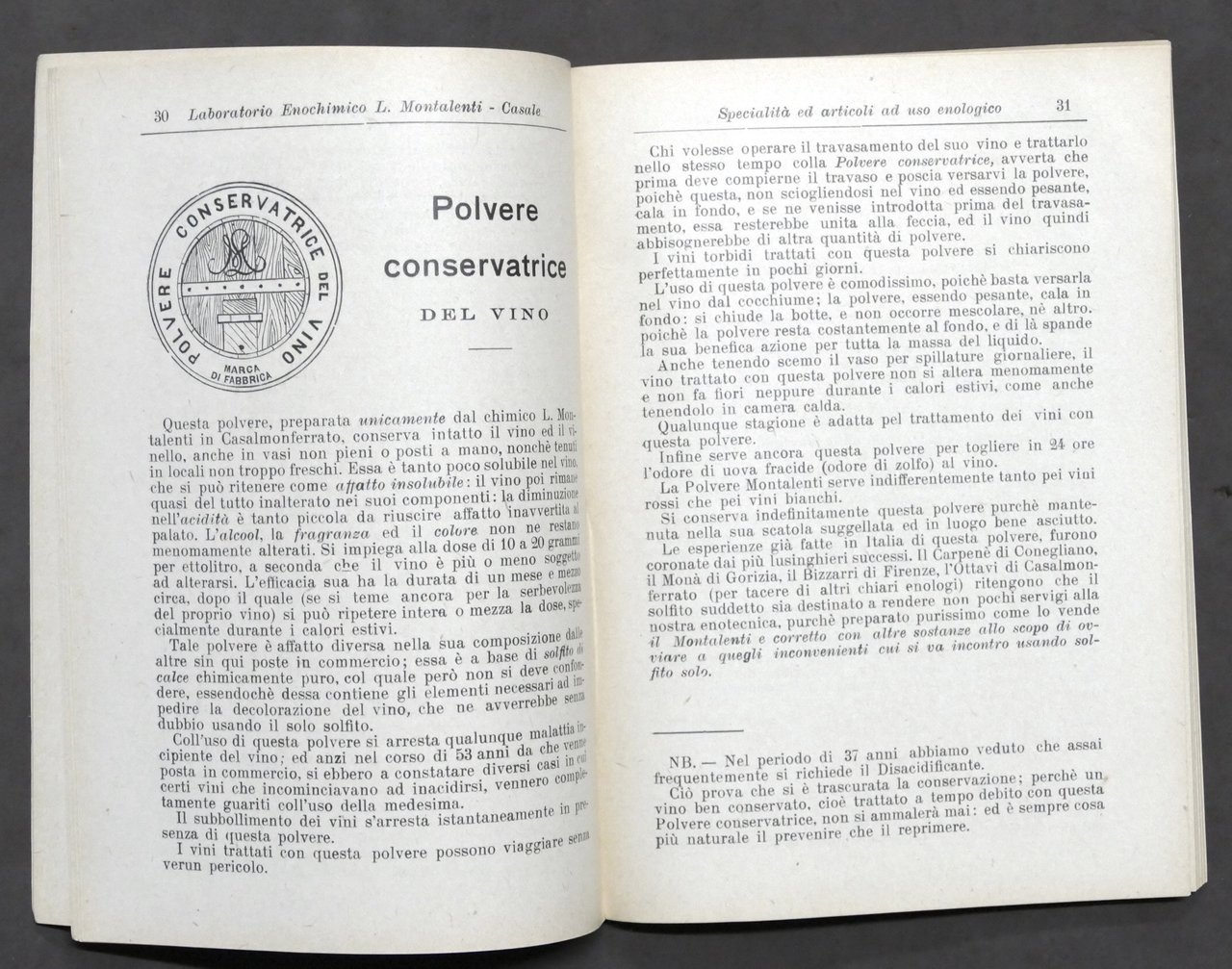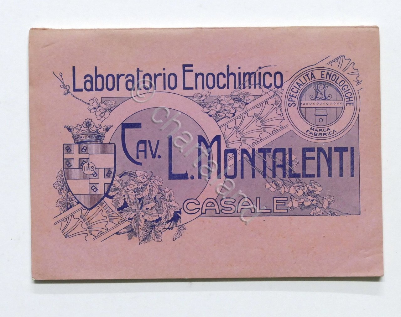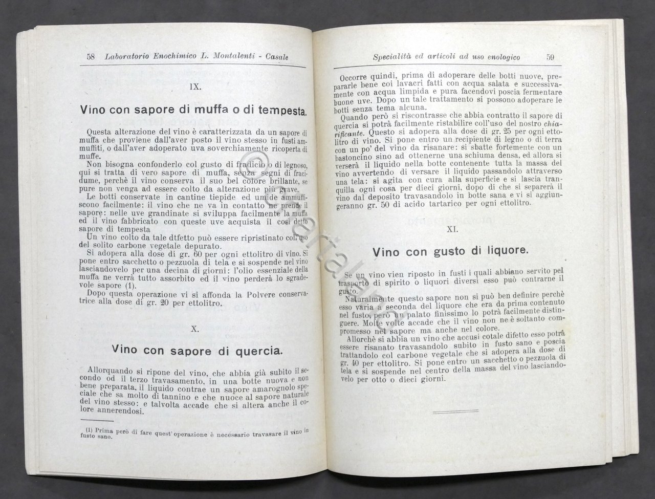 Enologia - Laboratorio Enochimico L. Montalenti - Casale - 1^ ed. 1929 Specialità ed articoli ad uso enologico. Pag. 118 (XXIV pagine tradotte in francese) Dimensioni: 12 x 17 cm. Copertina morbida - Testo in italiano. Condizioni molto buone.
