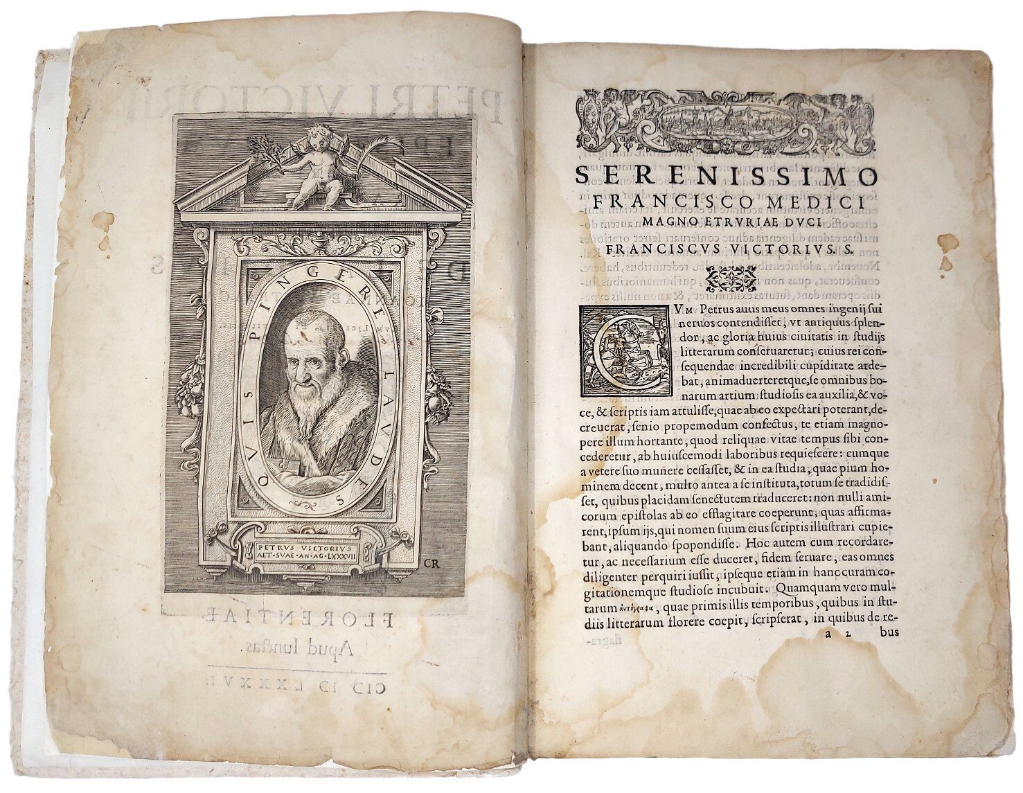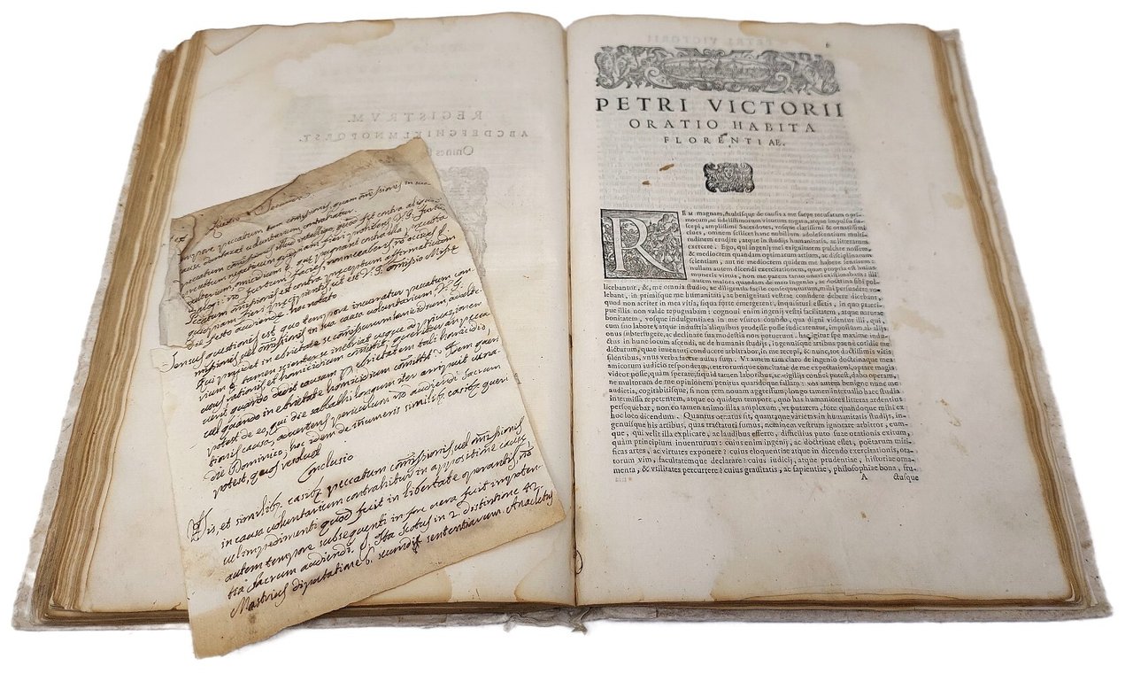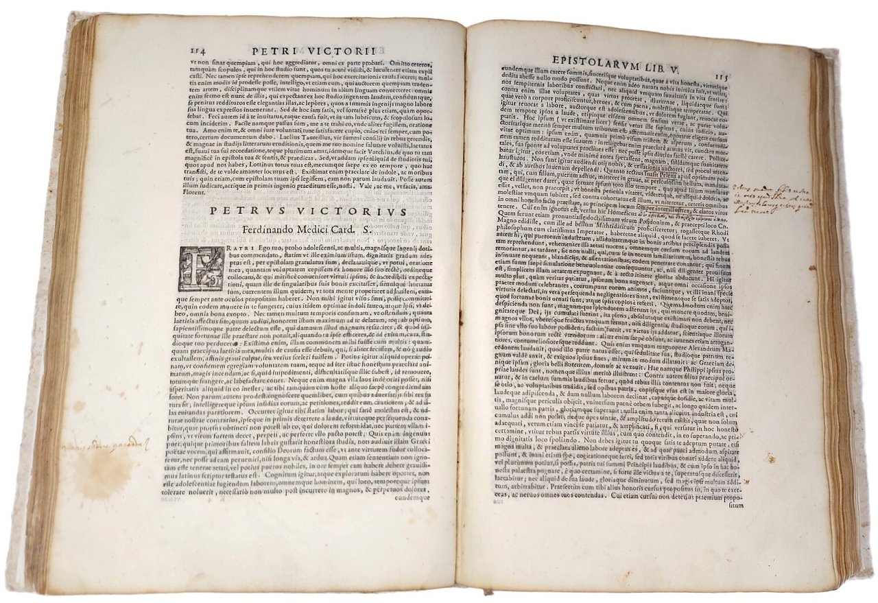 >in-folio (318x215 mm), pp. (12), 226, (2 di colophon), 72, ritratto a piena pagina al verso del frontespizio, impresa col giglio fiorentino al titolo (var. A) e sul colophon, testatina con veduta di Firenze e iniziali ornate in xilografia. Legatura tarda in cartonato rustico (con piccole mancanze). Prima edizione, dedicata a Francesco de' Medici da Francesco Vettori, nipote dell'autore ed editore dell'opera, impressa postuma l'anno successivo alla sua morte. L'epistolario si compone di 216 lettere, suddivise in 10 libri e composte a partire dal 1535, ossia nel pieno della sua lunga e operosa carriera umanistica. Testo preziosissimo, sia perché nelle lettere sono incluse le prefazioni e le dediche delle opere classiche di cui curò l'edizione, sia perché Vettori corrispose con importanti figure del panorama politico e culturale del '500 italiano e tedesco. In alcuni esemplari, come il presente, le Orationes sono legate in fine, dopo il colophon, laddove tipicamente sono poste dopo i fogli preliminari. Esemplare da studio, benché marginoso; con aloni d'umido ai margini, più severi ai primi ff. e in particolare al frontespizio (con antico rinforzo della carta agli angoli), forellino di tarlo al margine inferiore di alcuni ff. delle Orationes; firma di possesso al titolo e note coeve ai margini, con appunto su foglio sciolto della stessa mano.  Adams V-674; Brunet V, 1179-80; Camerini 133: «Edizione insolitamente suntuosa».