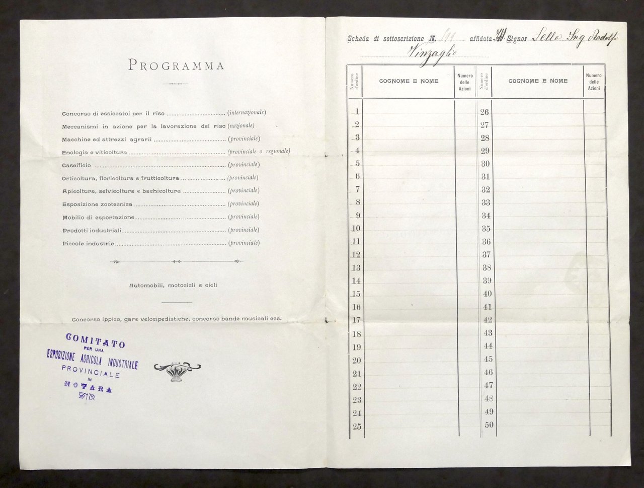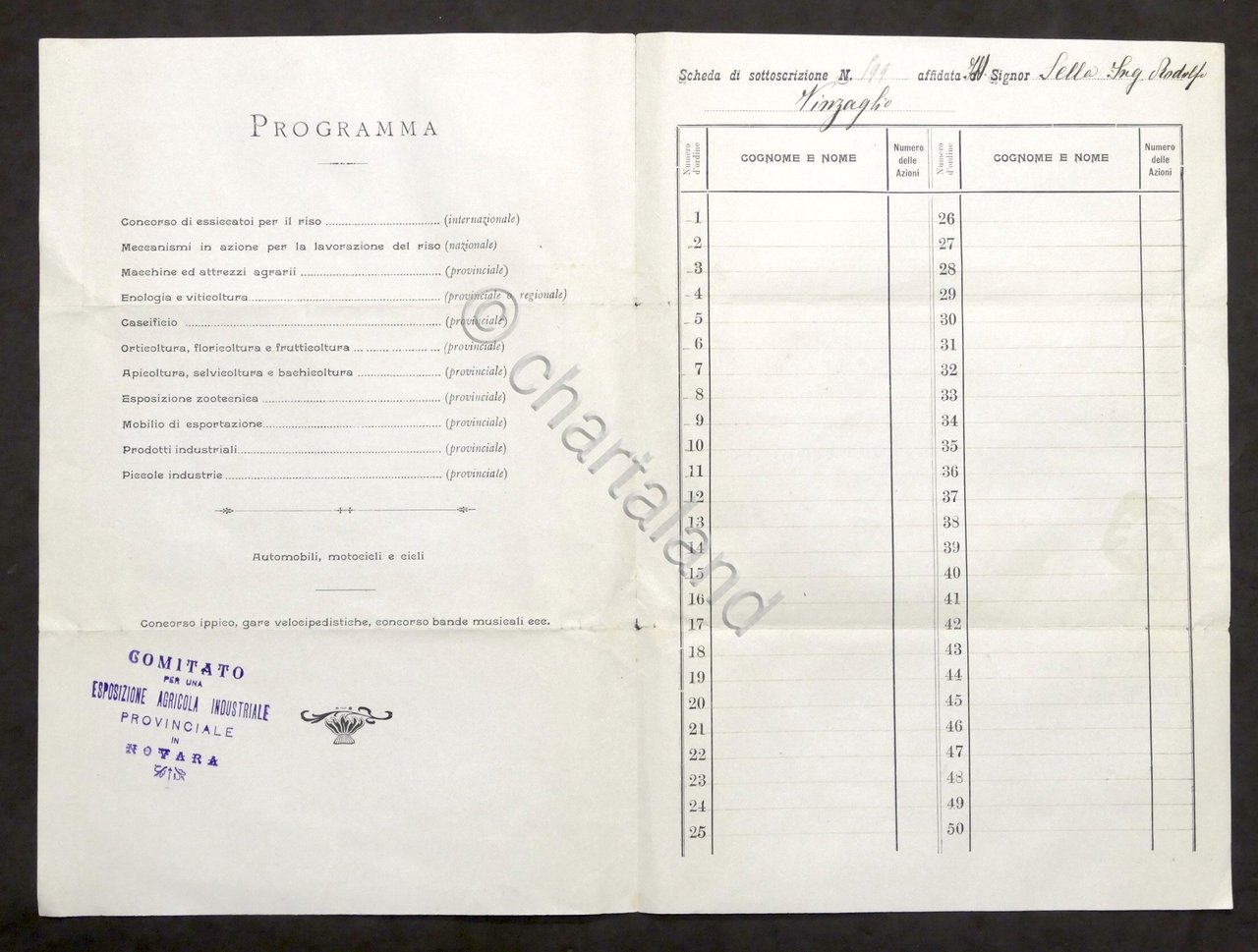 Esposizione Provinciale Novara - Scheda Prenotazione Azioni - Sella - 1901