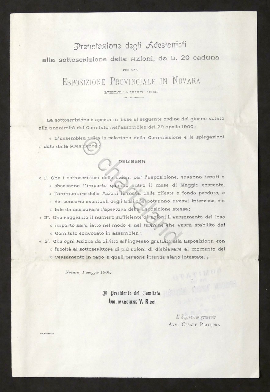 Storia locale Piemonte Esposizione Agricola Industriale Provinciale in Novara - Scheda Prenotazione Adesionisti alla sottoscrizione delle Azioni, da L. 20 cadauna - Nominativa Ing. Rodolfo Sella - Vinzaglio - Anno 1901 Pag. 3 Copertina mobida - Testo in italiano. Condizioni molto buone.