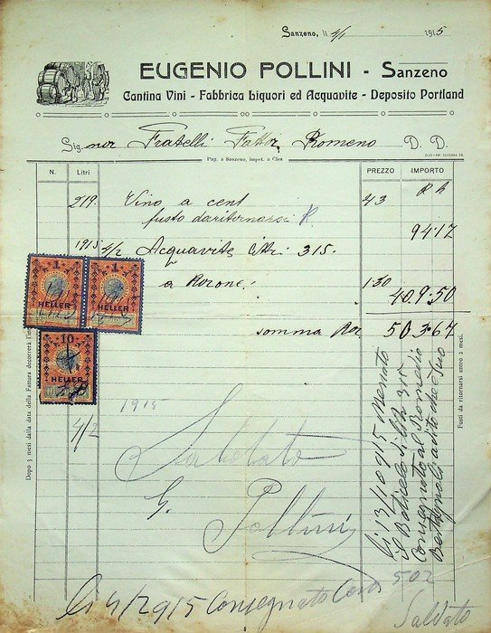 Eugenio Pollini - Sanzeno: cantina vini - fabbrica liquori e acquavite - deposito Portland. | Libri antichi e moderni | [Val Di Non - Sanzeno - Cantina Vinicola - Vini - Enologia].