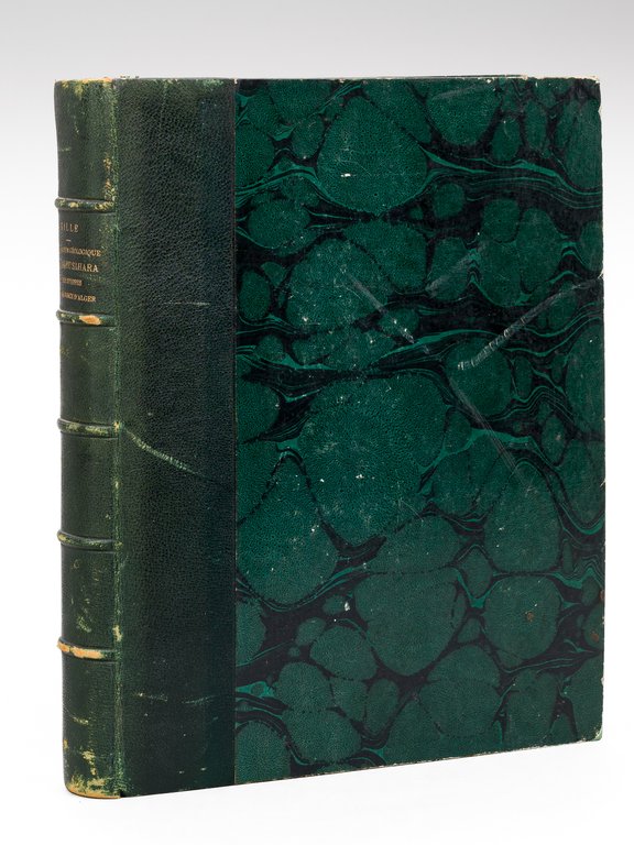 1 vol. in-4 reliure demi-chagrin vert, dos à 5 nerfs, Imprimerie Nationale, Paris, 1872, 2 ff., VI-540 pp. avec 162 figures dans le texte, souvent en couleurs (coupes), 8 planches hors texte (7 eaux-fortes et une grande planche dépliante en couleurs en 14 volets : coupes géologiques), et 3 grandes cartes dépliantes en couleurs. Rare exemplaire de ce bel ouvrage, richement orné dans le texte de belles coupes géologiques en couleurs, et bien complet de l'impressionnante coupe géologique dépliante en couleurs, ainsi que des trois très belles cartes en couleurs, dépliantes : : "Carte géologique du Beni Mzab, du Sahara et de la région des steppes de la Province d'Alger" par M. Ludovic Ville ; "Carte de la Province d'Alger" et "Carte géologique du Sahara oriental par M. Ville, exécutée en 1872 par report sur pierre de la carte topographique du Sahara oriental publiée par le Dépôt de la Guerre en 1861". Bon état (dos un peu frotté, plats très lég. frotté, bon exemplaire par ailleurs).