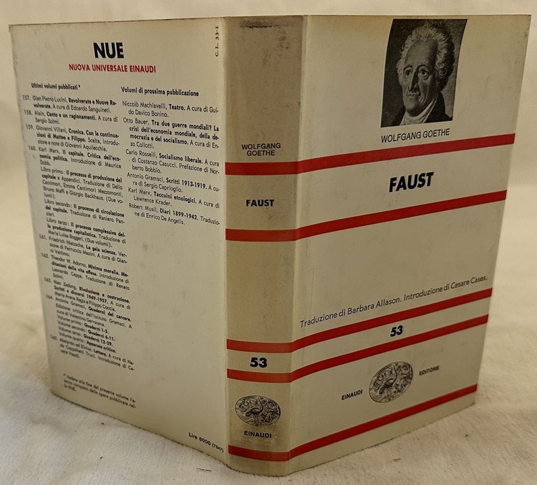 Edizione Einaudi del 1979 del Faust di Wolfgang Goethe. introduzione di Cesare Cases. Traduzione di Barbara Allason. In ottime condizioni. Copertina in tela editoriale con sovraccoperta in ottime condizioni generali con lievi usure marginali. Legatura in buone condizioni. Pagine in buone condizioni con rare fioriture. In 8. cm 18,5x12. Pp. CVI+377+(10).Edition of 1979 of Faust by Wolfgang Goethe. Introduction by Cesare Cases. Trnaslation by Barbara Allason. In very good conditions. Cloth editorial cover with dustjacket in very good conditions lightly worn in the extremities. Binding in good condition. Pages in good conditions with occasional foxing. In 8. cm 18,5x12. Pp. CVI+377+(10).