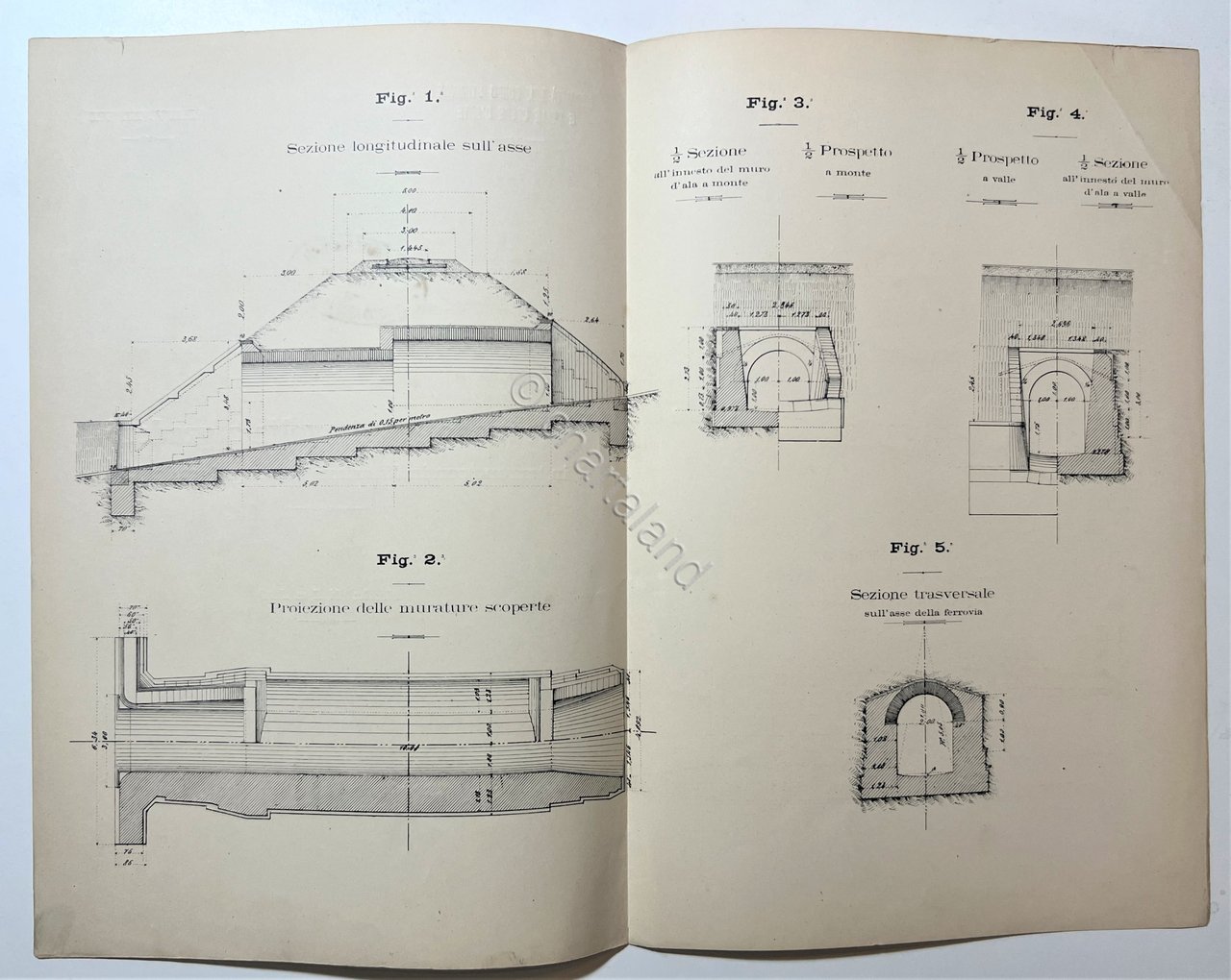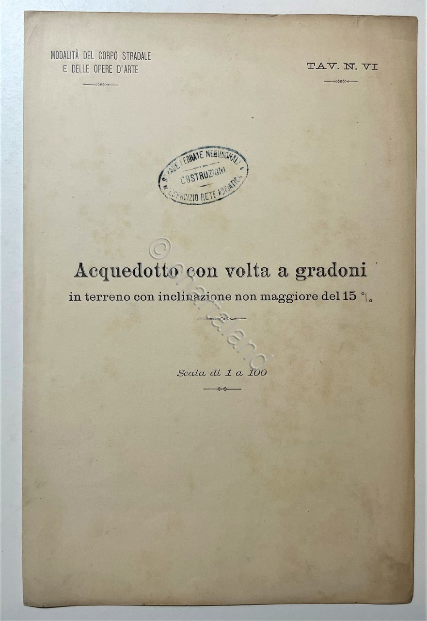 Modalità del Corpo Stradale e delle Opere d'Arte - Acquedotto con volta a gradoni, Tavola N. VI - fine '800 Testo in lingua italiana. Pagine 4 con 5 Fig. Copertina morbida. Condizioni molto buone con piccoli segni del tempo.