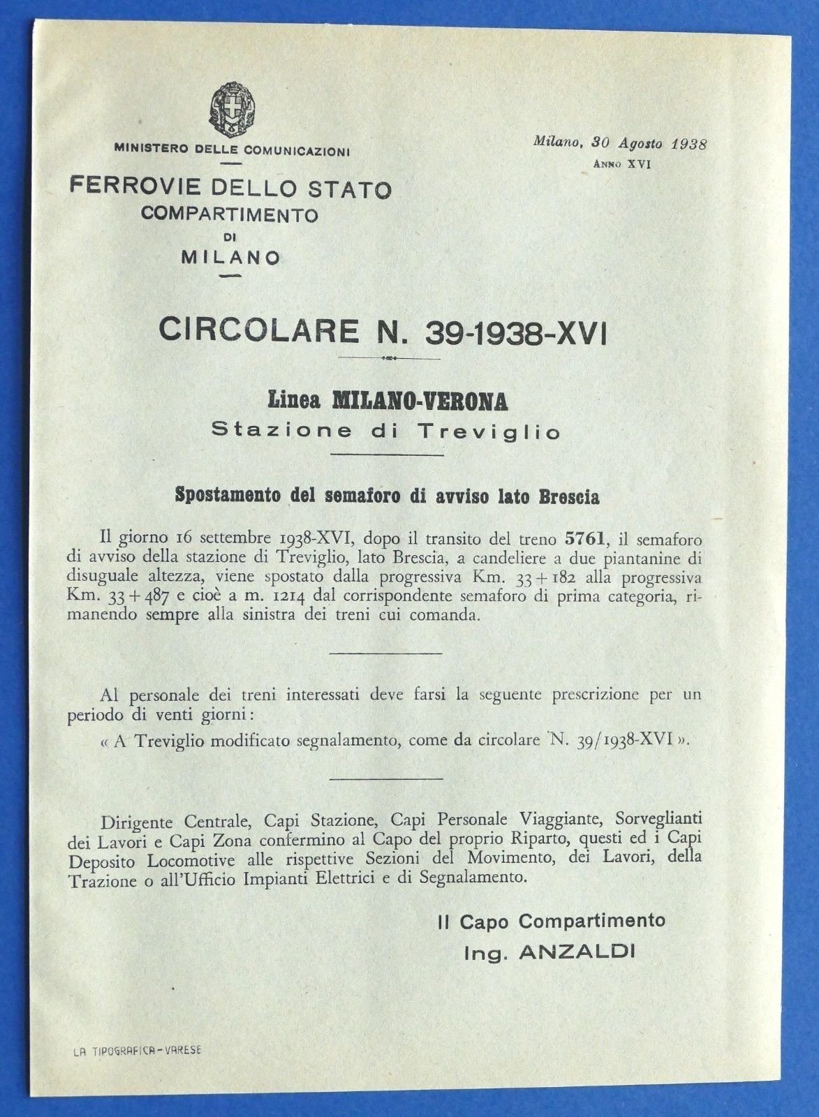 Ferrovie - Circolare N° 39 - 1938 - Stazione di Treviglio - Spostamento semaforo | Libri antichi e moderni |