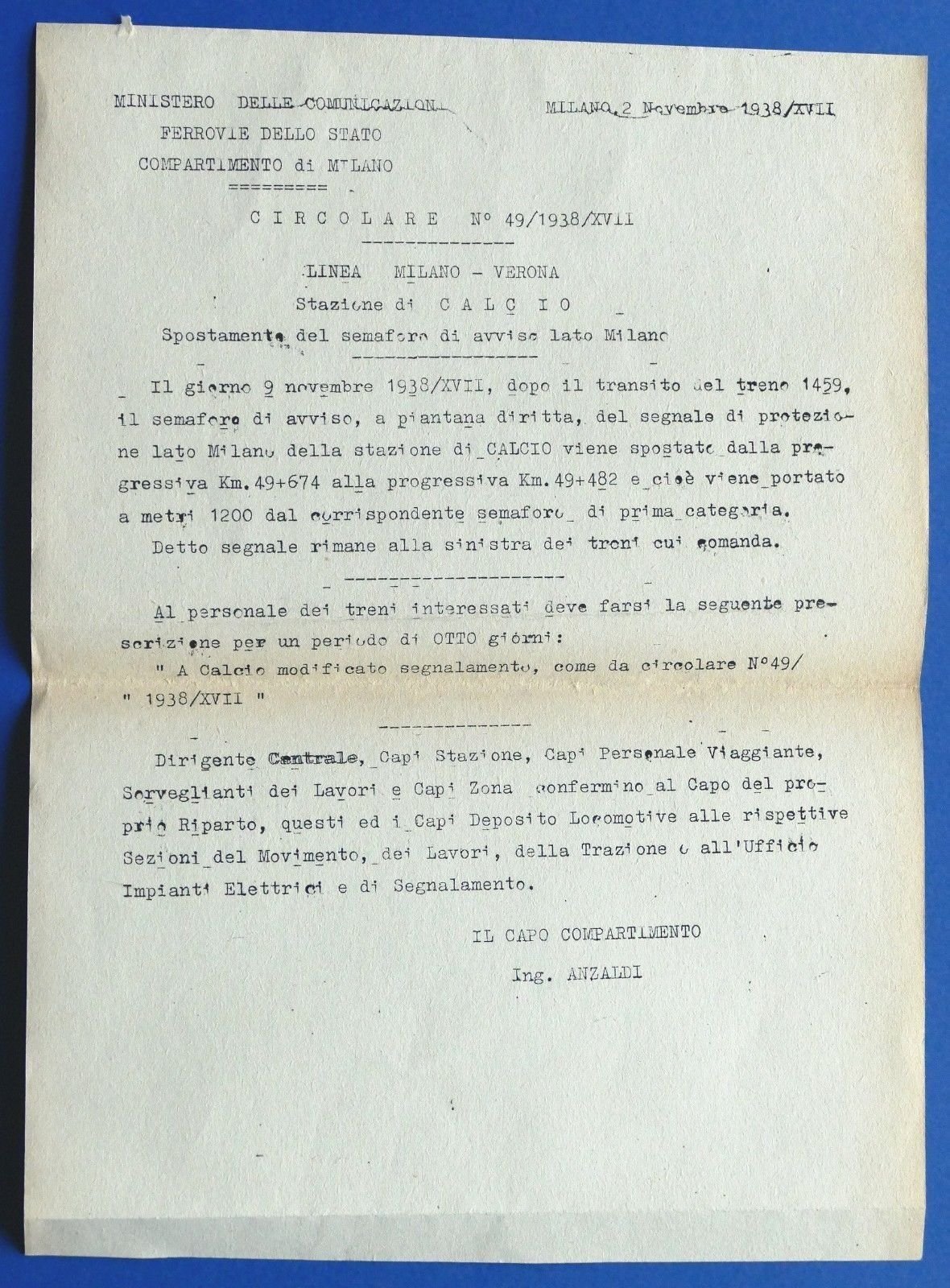 Ferrovie - Circolare N° 49 - 1938 - Stazione di Calcio - Spostamento semaforo