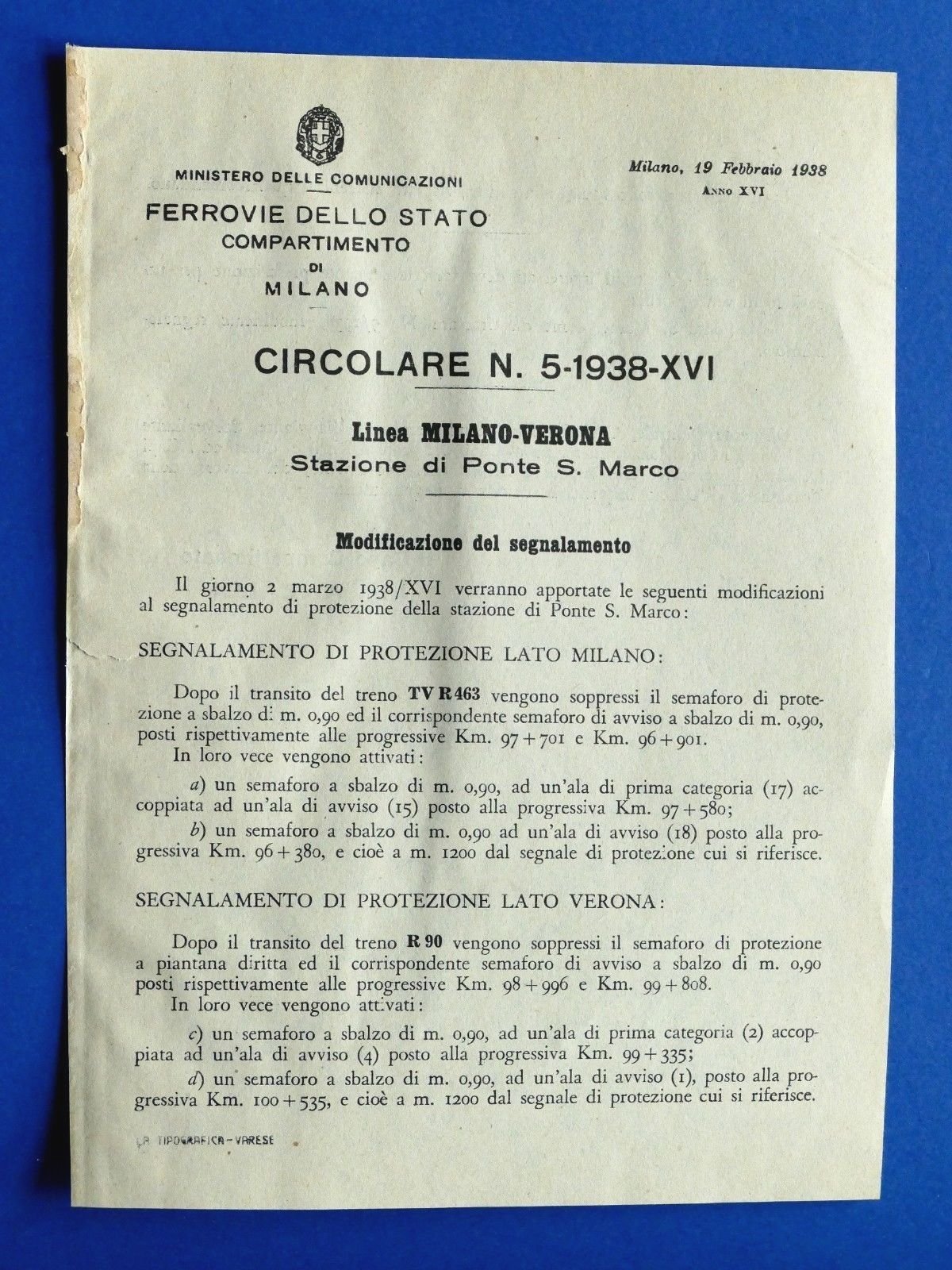 Ferrovie - Circolare N° 5 - 1938 - Linea Milano Verona - Stazione Ponte S. Marco