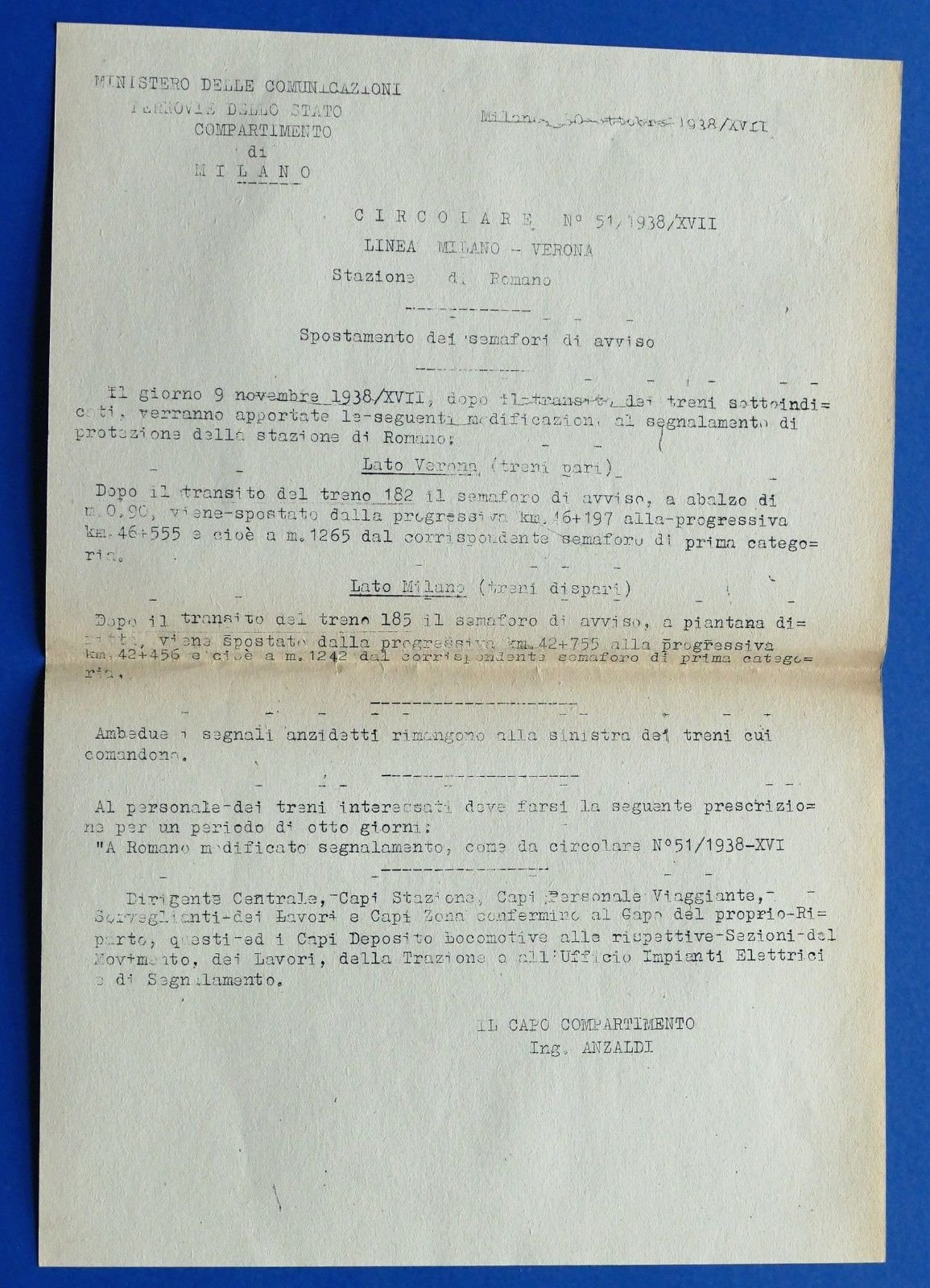 Ferrovie - Circolare N° 51 - 1938 - Stazione di Romano - Spostamento semafori | Libri antichi e moderni |