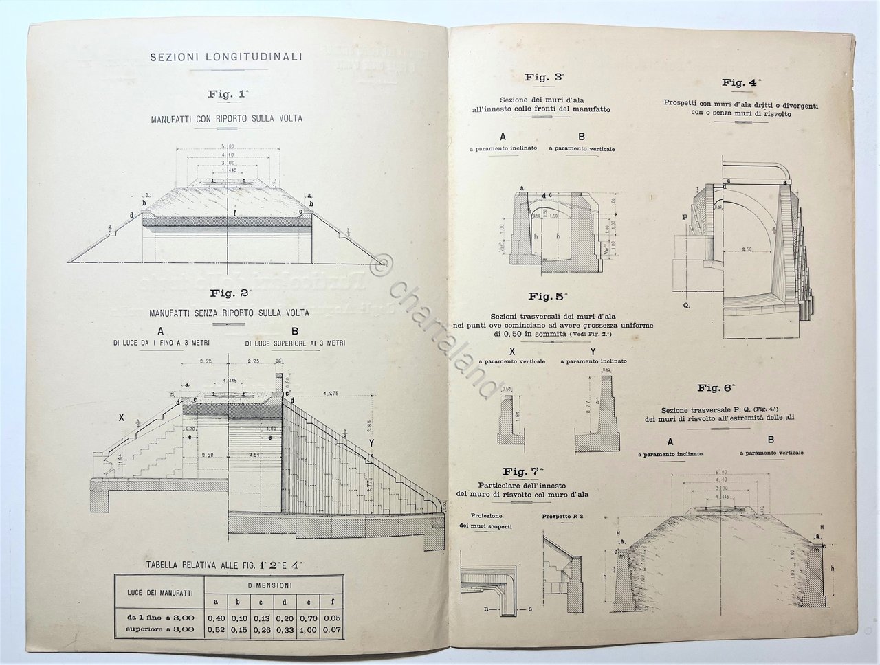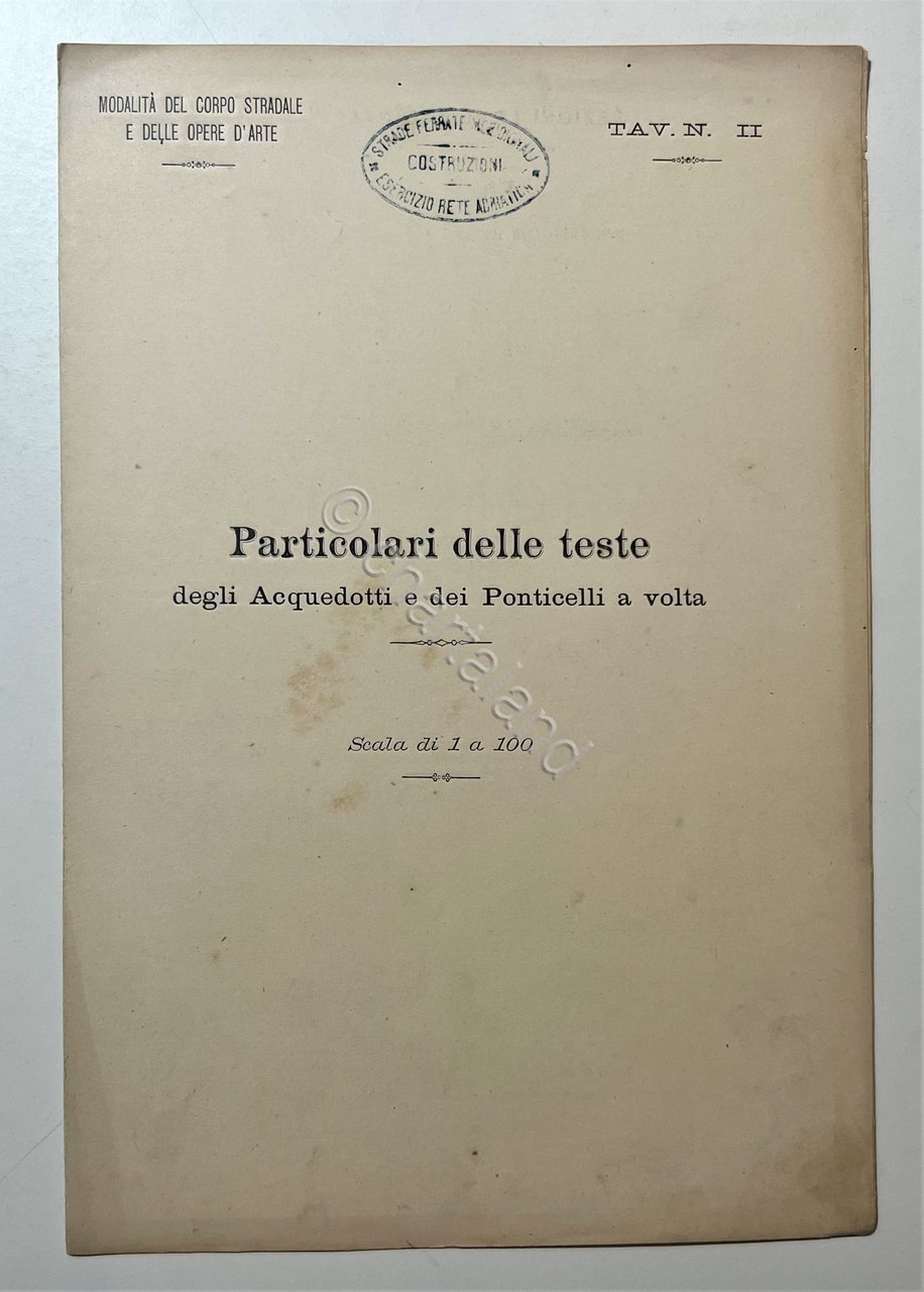 Modalità del Corpo Stradale e delle Opere d'Arte - Strade Ferrate Particolari delle teste degli Acquedotti e dei Ponticelli a volta, Tavola N. II - fine '800 Testo in lingua italiana. Pagine 4 con 7 Fig. Copertina morbida. Condizioni molto buone con piccoli segni del tempo.