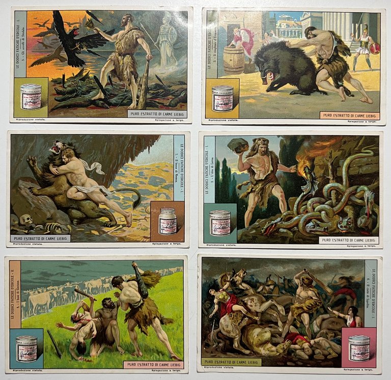 Figurine LIEBIG - Le dodici fatiche d'Ercole - Rif. N° 1206 - 6 Figurine La numerazione fa riferimento al Catalogo Sanguinetti. Condizioni molto buone con piccoli segni del tempo come da foto. FOTOGRAFIE DEL RETRO A RICHIESTA.