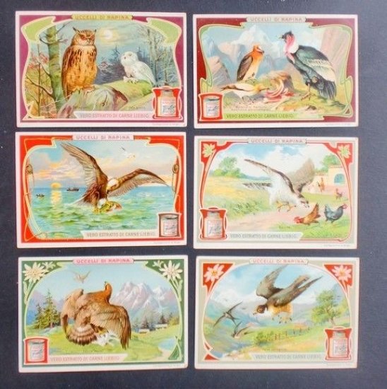 Figurine LIEBIG - Uccelli  di Rapina - Rif.  N° 872 - 6 figurine La numerazione fa riferimento al Catalogo Sanguinetti - FOTOGRAFIE DEL RETRO A RICHIESTA. Per appassionati e collezionisti