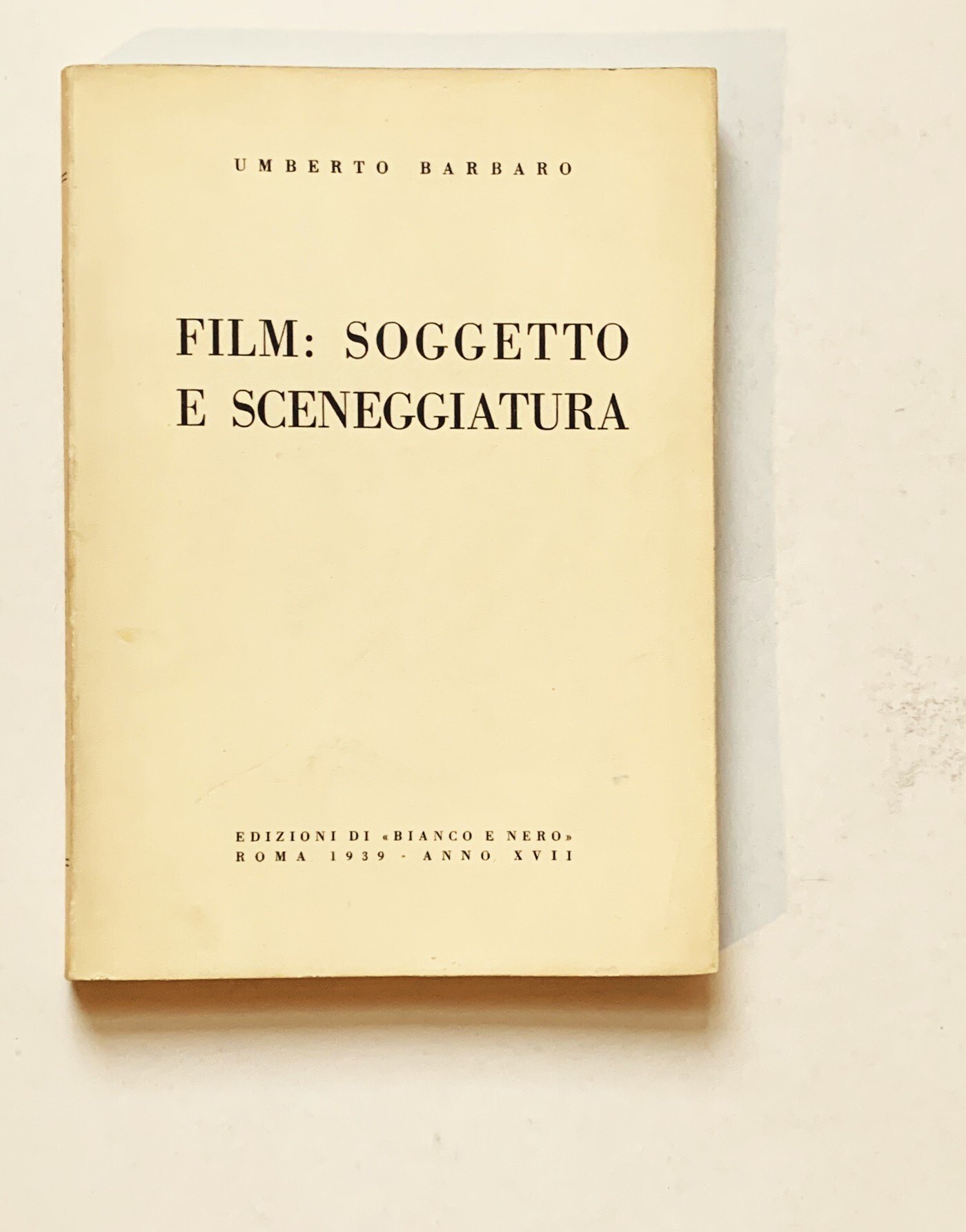 I ed.: Agosto 1939 - Anno XVII. VIII/ 176+XLVIII patinate con illustrazioni in b/n/ brossura in cartoncino liscio avorio con titoli in nero. Stato buono (lieve usura della copertina - copertina e pagine brunite - timbro blu omaggio all'occhiello). Indice: prefazione; Luigi Chiarini - Il problema estetico del film (Arte del film - Potenza del film - tecnica del film) - Il soggetto (La trama - Il tema - Requisiti cinematografici del soggetto) - Il trattamento (La struttura generale del film - Il materiale plastico) - La sceneggiatura (Definizioni - La sceneggiatura e i problemi della ripresa) - Esempi di sceneggiature (Darò un milione - Episodio - Avventura a mezzanotte - Il fu Mattia Pascal) - Bibliografia - Atlante (Tratto dal film didattico del Centro Sperimentale di Cinematografia "I mezzi espressivi del cinema", diretto da Luigi Chiarini, realizzato da Paolo Uccello e Renato May, col materiale della Cineteca del Centro. Riprese dirette di Antonio Schiavinotto) - Don Chisciotte di G. W. Pabst (31 fotogrammi).