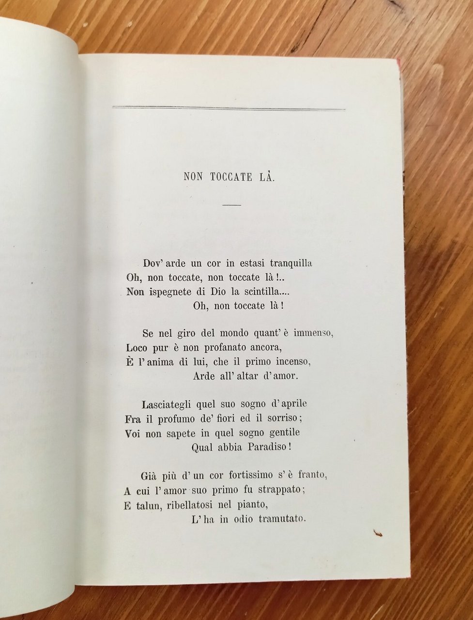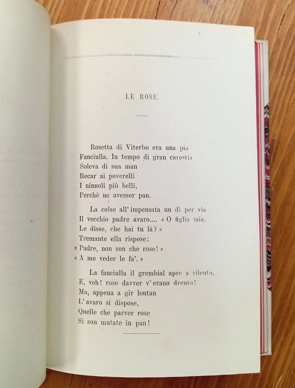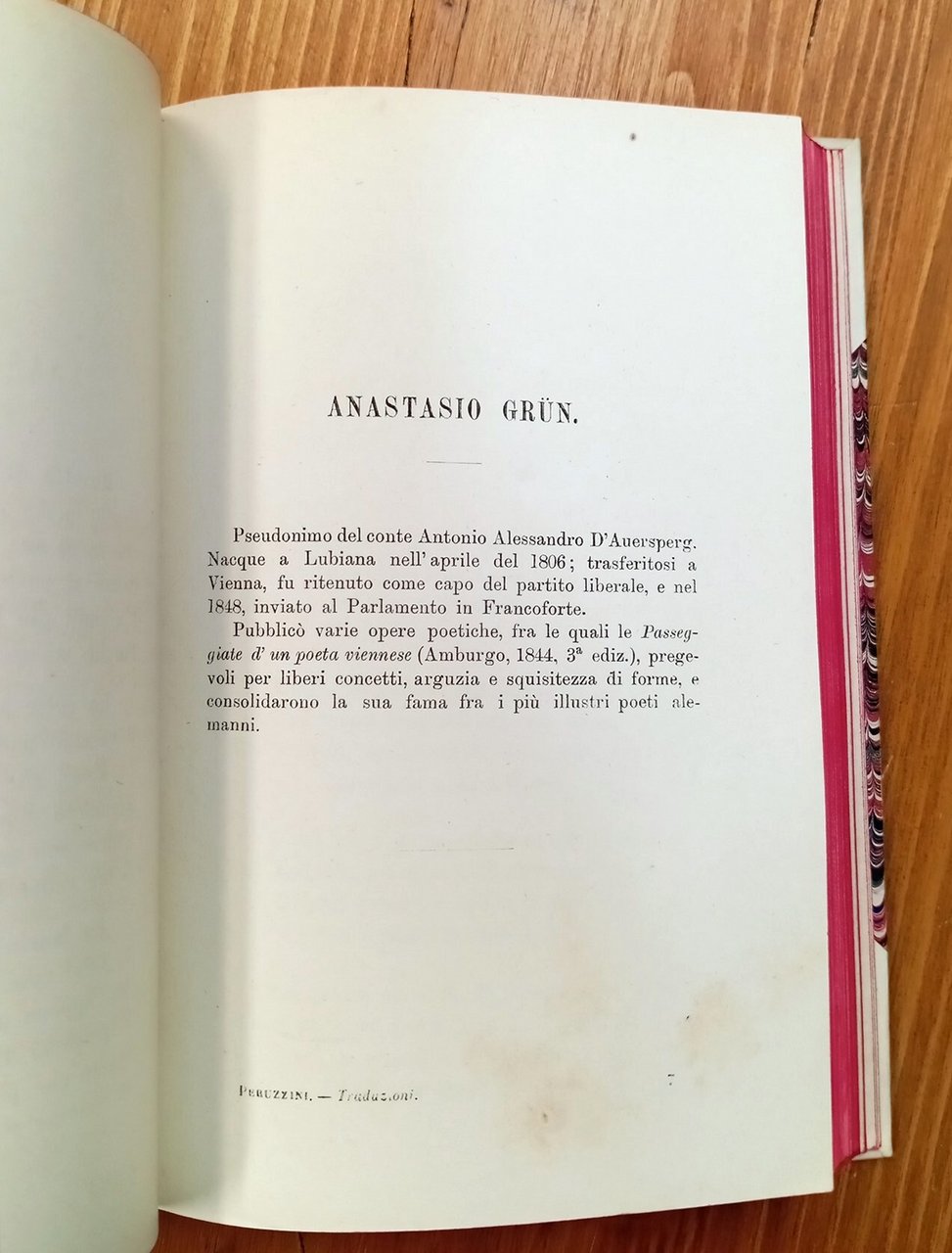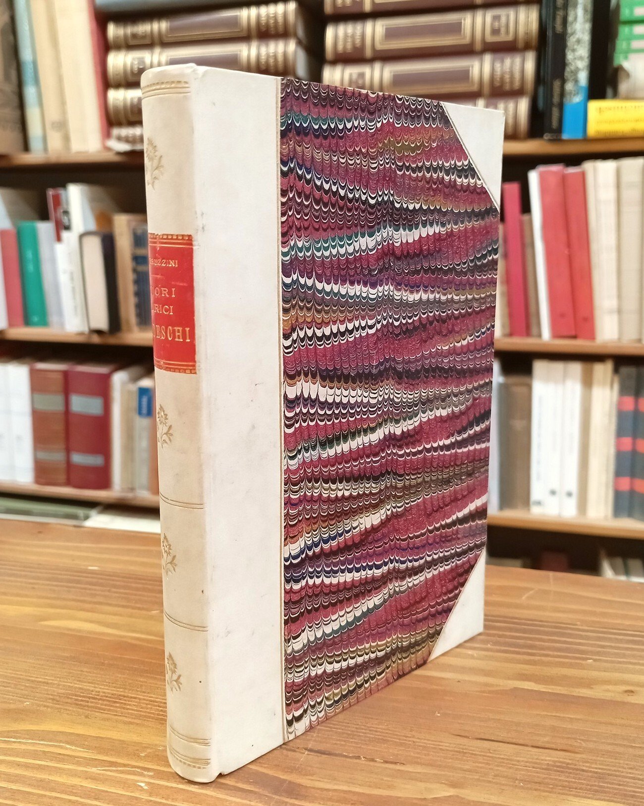 Prima edizione - Volume rilegato in copertina rigida amatoriale con dorso e angoli in pelle, piatti pavonati, titolo e fregi in oro al dorso, tagli dipinti in rosso, xiii-333 pagine. Ogni autore dell'antologia è presentato da una breve nota biografica. Traduzioni in italiano di Giovanni Peruzzini; prefazione di Giacomo Zanella. Piccolo timbro privato alla sguardia anteriore, sporadiche fioriture, peraltro esemplare in ottimo stato di conservazione con paginazione compatta e legature ben salde; libro non comune.