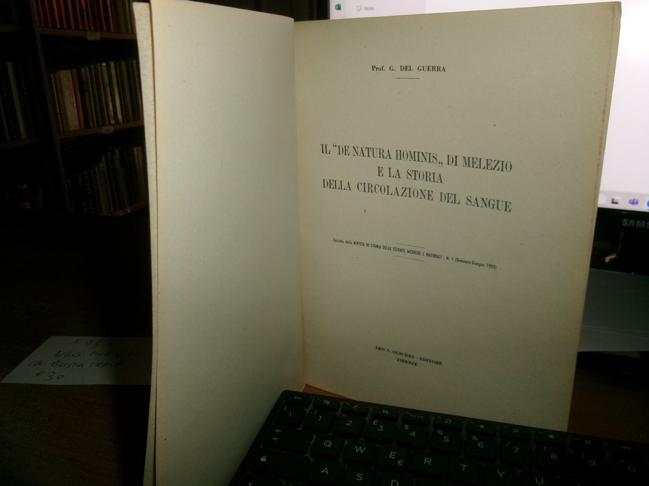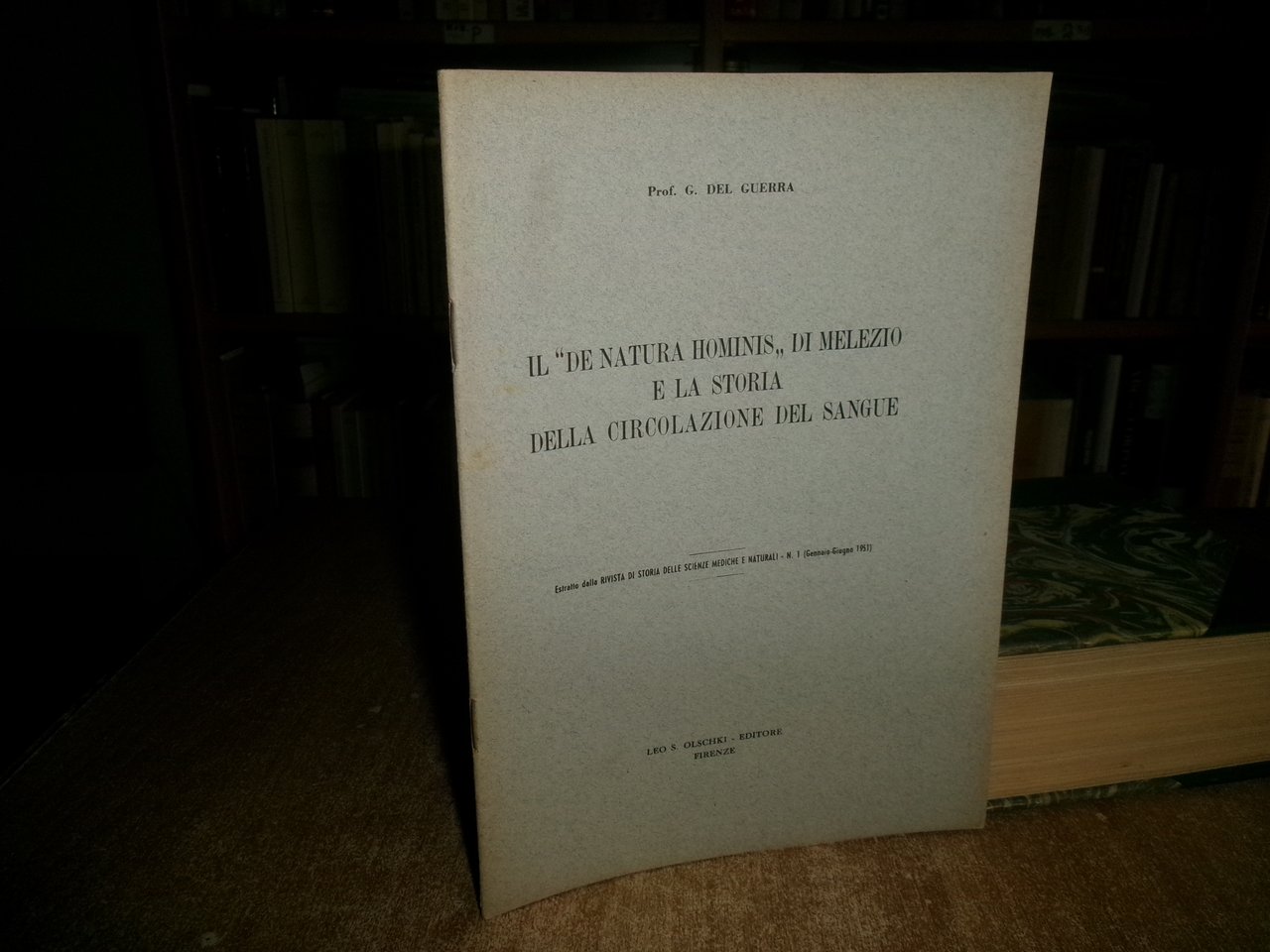 G. Del Guerra. IL " De Natura Hominis" di Melezio e la storia della circolazione del sangue (estratto). Firenze, Leo S. Olschki, 1951. In-8°, br. orig. con punti metallici. 35 pp. con alcune illustrazioni n.t. Opuscolo in ottimo stato. Neg. mob. 2 bis in busta trasp.