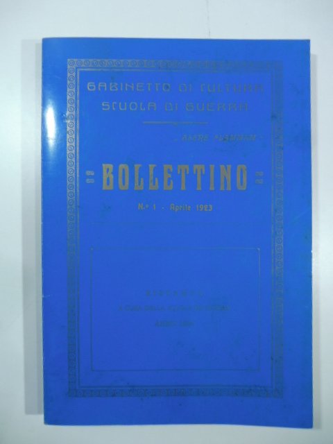 In 8, cm. 16 x 23, pp. 67 + XIV + v, brossura editoriale con normali segni del tempo.Ristampa anastatica del bollettino n.1 del 1923, voluta dalla scuola di Guerra per dare risalto al valore etico e culturale delle radici dell'Istituto.