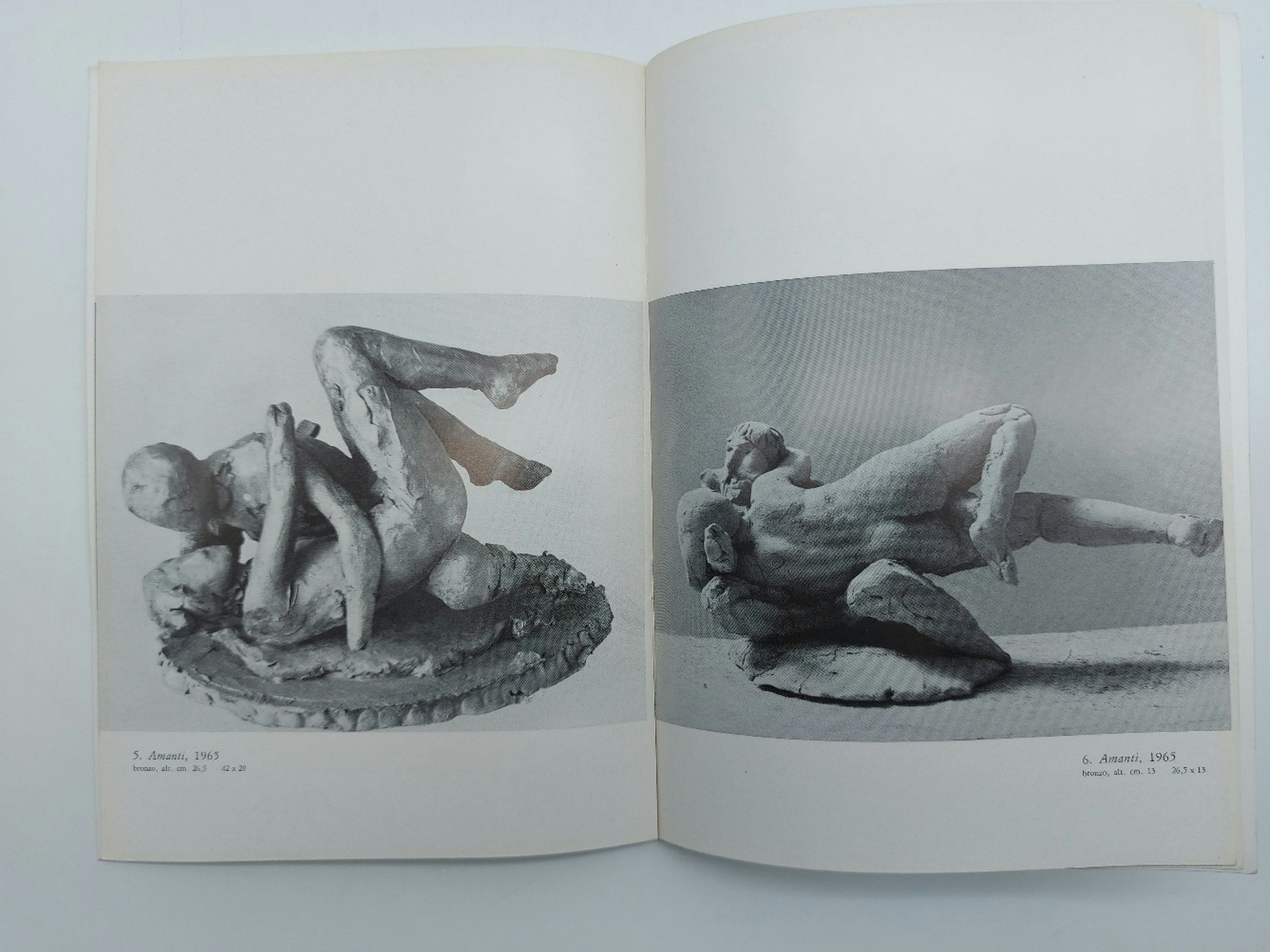 In 8 (cm 16,5 x 23,5), pp. (16) con 12 riproduzioni fotografiche in bianco/nero di sculture del ciclo degli Amanti. Brossura editoriale. Catalogo della mostra di opere di Giacomo Manzu' svoltasi alla Galleria Galatea di Torino del 1967. Testo critico di presentazione di Luigi Carluccio e una poesia di Raffaele Carrieri dal titolo "Gli amanti di Manzu'".