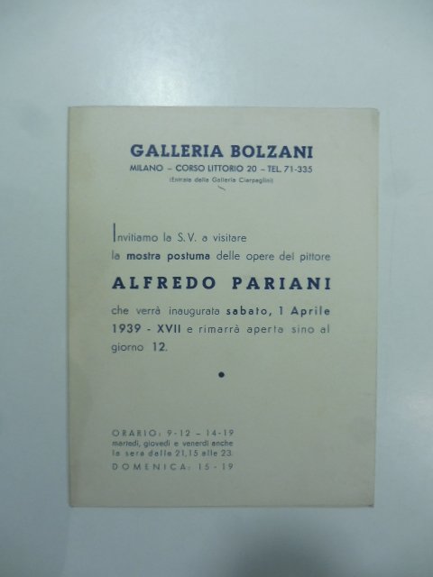 Galleria Bolzani, Milano. Invitiamo la S. V. a visitare la mostra postuma delle opere del pittore Alfredo Pariani. Invito alla mostra | Libri antichi e moderni | Anonimo