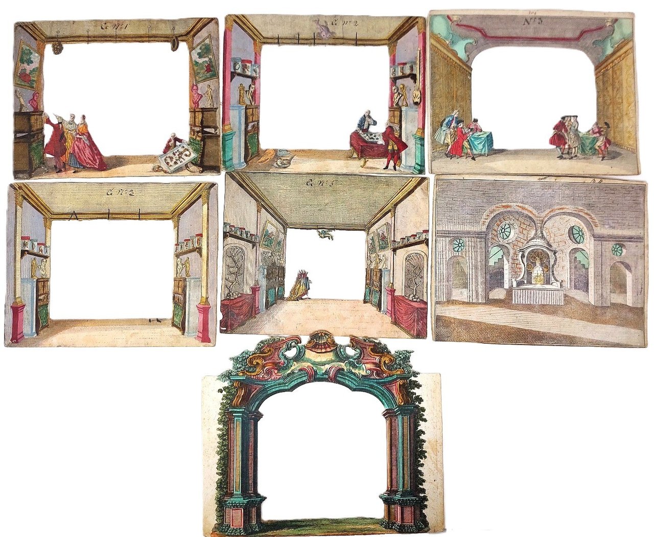 >serie di sette sette incisioni in rame (ciascuna di mm 188x235) su carta ritagliata con cura e con colorazione coeva. In questo diorama teatrale alcune tavole sono numerate nel margine superiore ed è stato rifilato il margine inferiore che doveva riportare le scritte Cum Priv. S.C. Maj. - Mart. Engelbrecht excud. A.V," In questa serie risulta di grande effetto l'infilata prospettica del colonnato, che diviene nell'immaginario quasi infinito; all'interno della Galleria si possono ammirare personaggi riccamente abbigliati mentre osservano, come in un Cabinet of Curiosities, gli oggetti più vari come sculture, tappeti, dipinti, minerali, animali, libri; sullo sfondo una sorta di fucina. Esemplare nitidamente colorato e in ottimo stato di conservazione, come raramente reperibile, soprattutto nelle parti ritagliate a punta di forbice (purtroppo le figurine in un paio di tavole sono mancanti: un personaggio ed alcuni dei reperti appesi al soffitto).