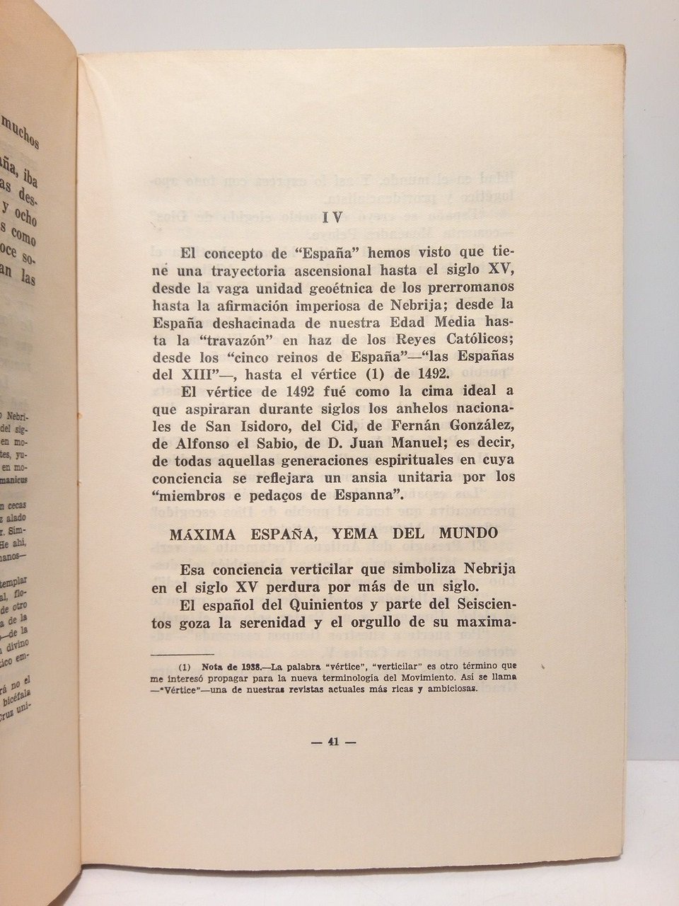 3ª Ed. [especial de lujo].- Zaragoza: Eds. Jerarquía, 1938.- 288 p.; 4º mayor (28,3 x 19,5 cm); Portada a dos tintas; Impreso en letra clara, grande negrilla y con amplios márgenes; Papel de hilo verjurado y ahuesado, conservando todas sus barbas; Rústica Ed.- Aunque no lo indica en el libro, esta fue una edición especialmente cuidada y de lujo.* Las cubiertas algo fatigadas. Interior en perfecto estado. En la cubierta anterior y una hoja central lleva manuscrita una firma de R. Ruiz-Giménez. IDEA DE ESPAÑA, DE LOS ESPAÑOLES Y DE LA CULTURA ESPAÑOLA EN GENERAL