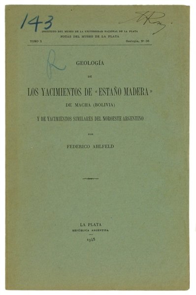 GEOLOGIA DE LOS YACIMIENTOS DE "ESTANO MADERA" DE MACHA (BOLIVIA) Y DE YACIMIENTOS SIMILARES DE NOROESTE ARGENTINO. | Libri antichi e moderni | Ahlfeld Fedeerico.