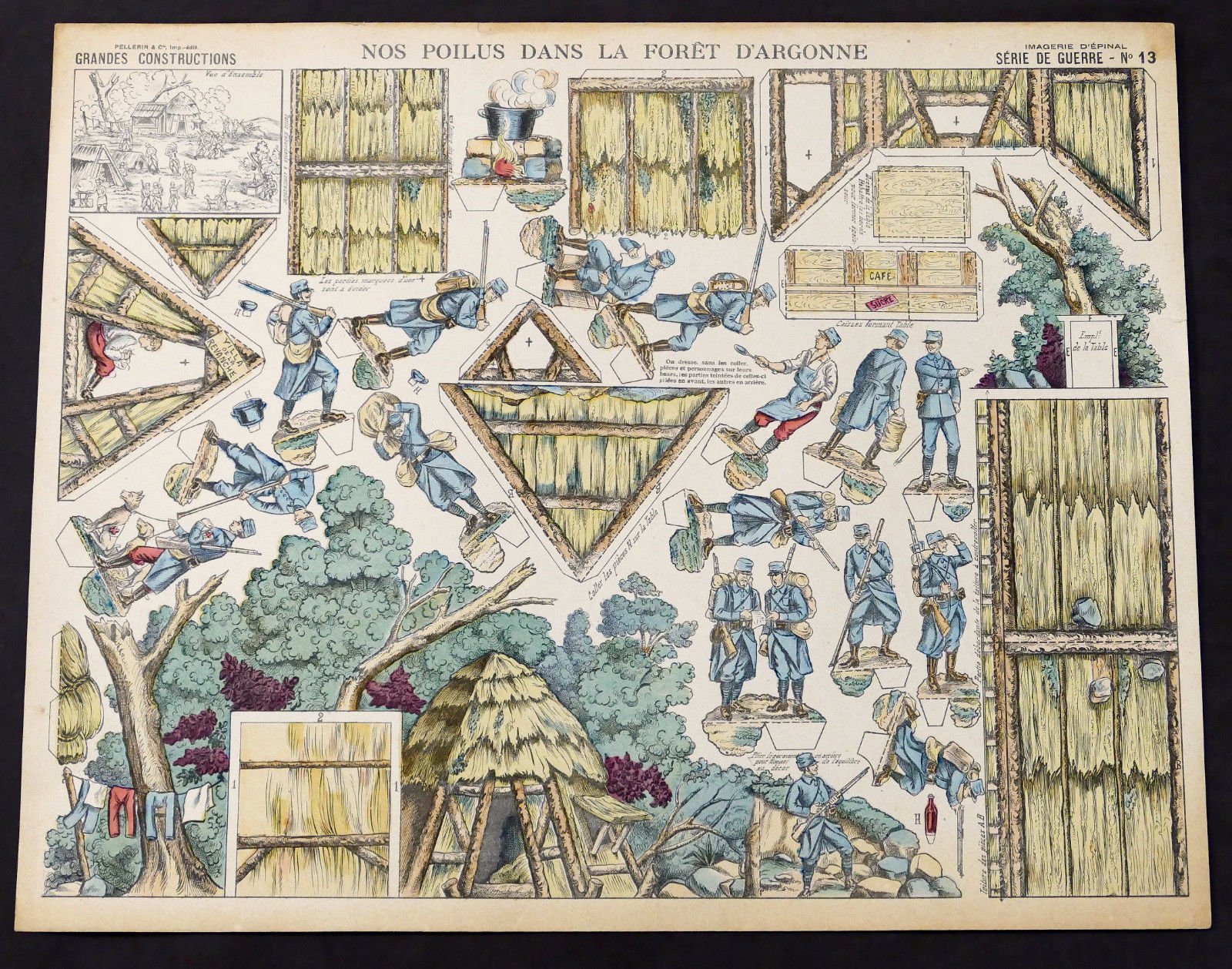 *** Gioco Costruzione - Imagerie d'Epinal - Serie de guerre N° 13 - Nos Poilus dans la Foret D'Argonne - 1900 ca. Dimensioni cartoncino 47,5 x 38 cm. Per appassionati studiosi e collezionisti