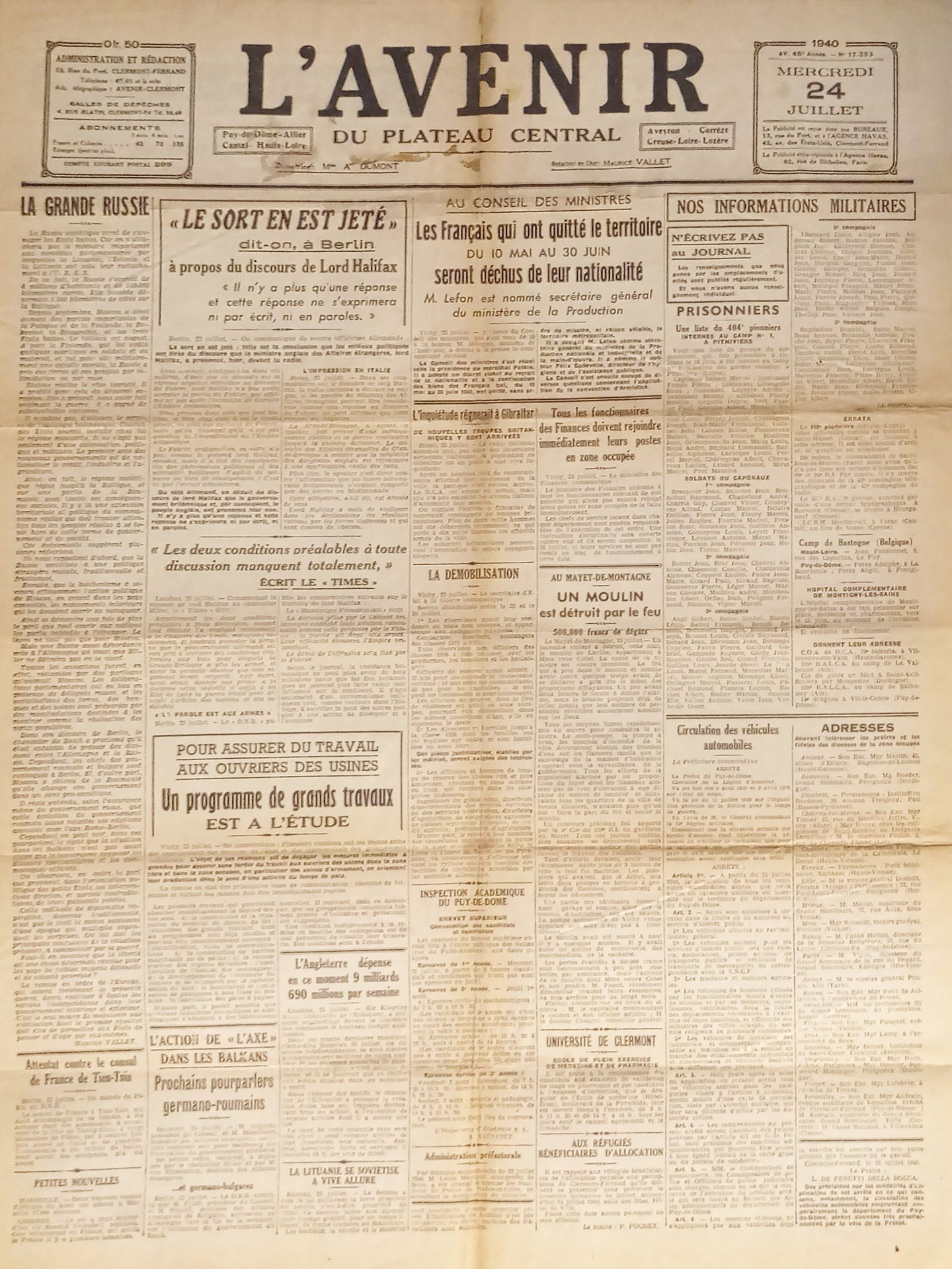 Giornale - L'Avenir N. 17.393 - 1940 Les Francais qui ont quitté le territoire