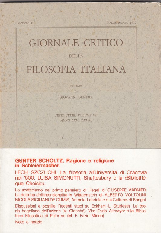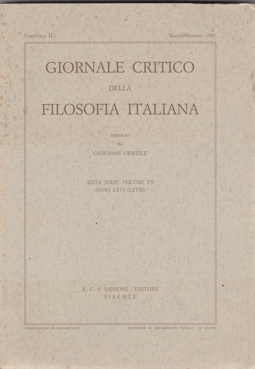 giornale critico della filosofia italiana. Volume VII. Fascicolo II. Maggio-agosto 1987
